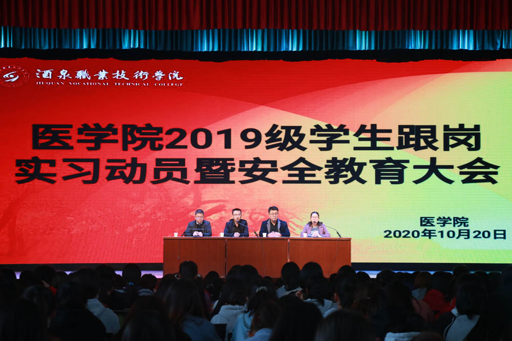 为促进产教融合,提升学生职业感悟,提高人才培养质量,加强学生安全防范意识,我院于2020年10月20日下午5点在胡杨文化活动中心召开了跟岗实习动员暨安全教育大会。医学院书记、院长范玉敏、副书记徐海平、副院长段国萍、杨文龙、2018级全体班主任、辅导员及全体见习学生参加了本次大会。