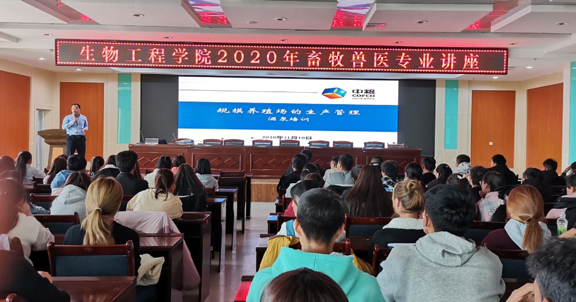 11月10日下午,中粮家佳康(张北)有限公司牛武总经理一行两人应邀为我院畜牧兽医类专业学生作专业讲座。此次讲座也是中粮学院2020年校企合作专业教学的一项内容。