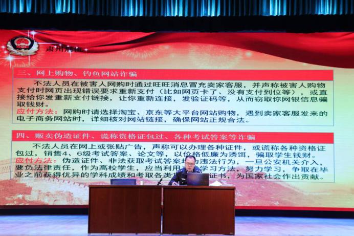 随后,高勃警官以“增强防范意识,学会遵法守法”为主题,用大量真实案例从人身安全、财产安全以及如何防盗、防网络诈骗等方面,进一步强调了安全法制教育的必要性,为同学们上了一堂生动的法制教育和安全防范课。