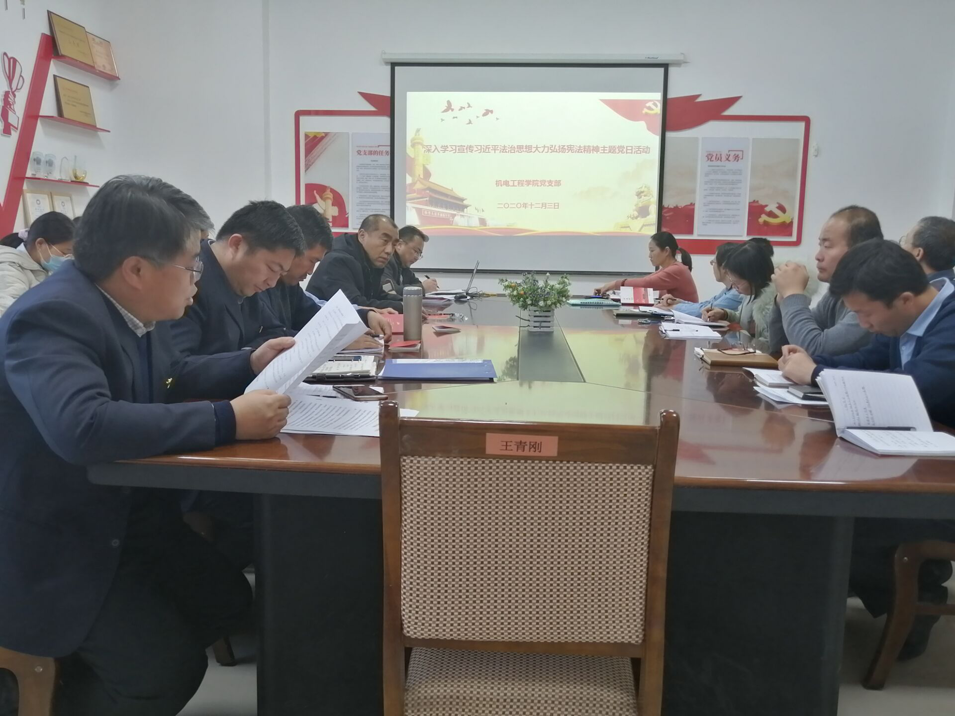 院系动态 > 正文 12月4日是第七个国家宪法日,同时也进入第三个“宪法宣传周”。为了深入学习贯彻落实党的十九届五中全会精神和习近平法治思想,12月3日下午,我院在行知楼710党员活动室开展“深入学习宣传习近平法治思想,大力弘扬宪法精神”主题党日活动。全体党员和部分入党积极分子参加了本次活动。