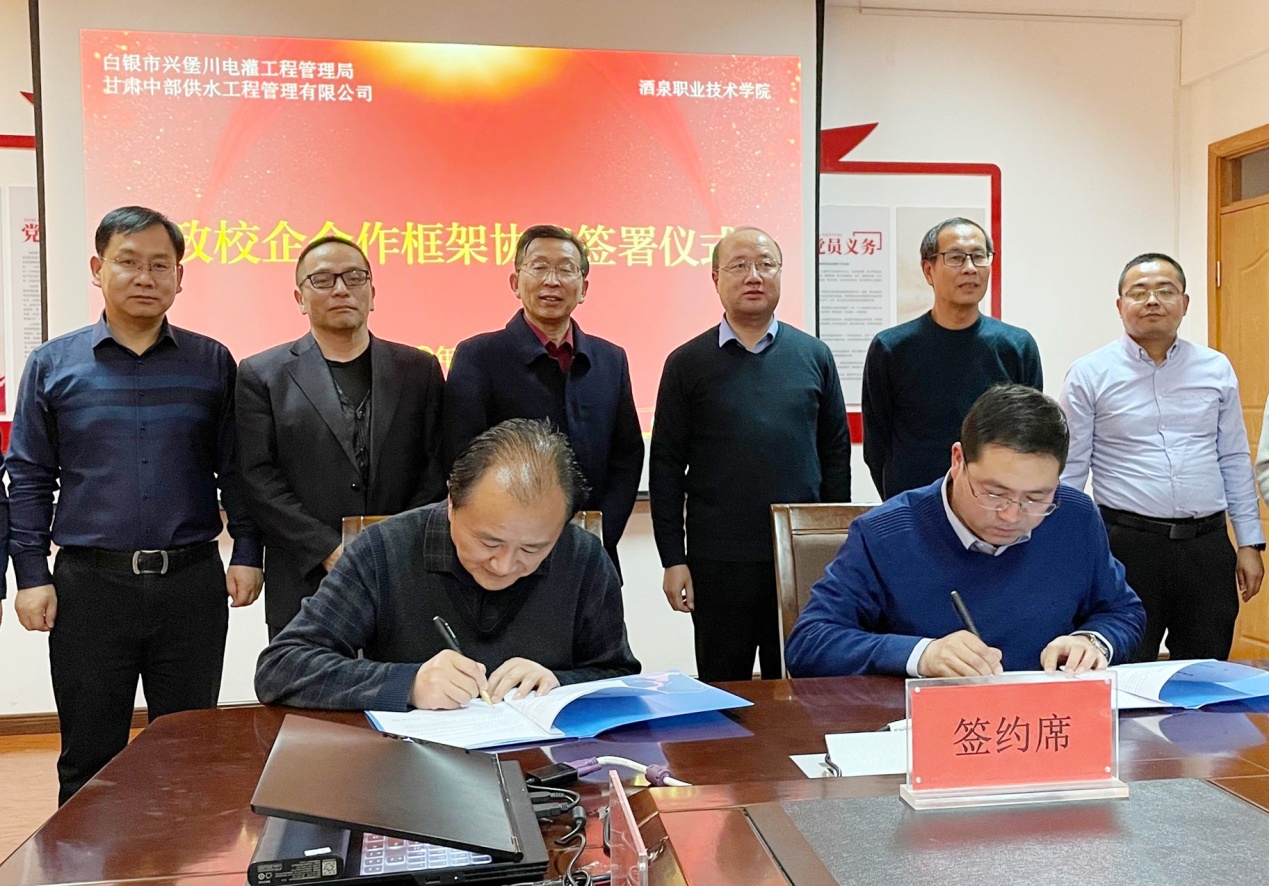 12月14日,白银市兴堡川电灌工程管理局党委书记、甘肃中部供水工程建设管理有限公司董事贾汝锟、副局长张百宇带领党委办公室、人事科、财务科以及机电科等相关部门负责人一行6人来我校考察交流,并与我校签订政校企合作框架协议。学校党委书记、校长易志军,党委委员、副校长王长荣出席签约仪式。