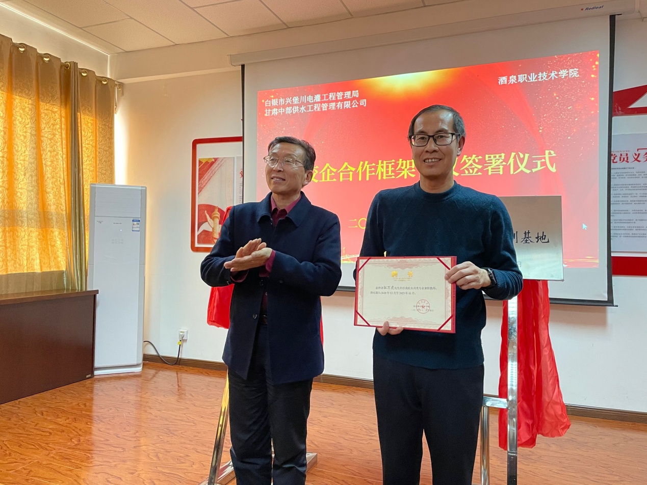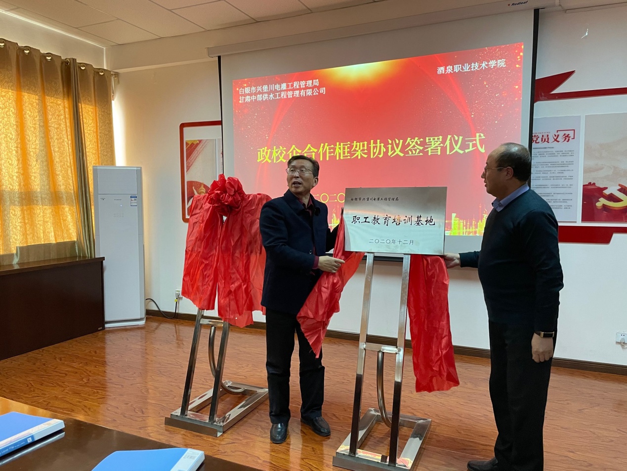 在签署仪式上,学校党委书记、校长易志军介绍了学校办学基本情况和产教融合实施情况,对双方前期的合作成果给予了充分肯定,对后期产教融合发展方向和要取得的实质性成果进行了规划;贾汝锟书记介绍了白银市兴堡川电灌工程管理局、甘肃中部供水工程建设管理有限公司基本情况,对双方前期合作情况给予了高度评价,并对双方后续的合作意向做了深入交流;滕振翔同学代表来自管理局的17名扩招学生汇报了在校一年来的学习生活情况;学校党委书记、校长易志军与贾汝锟书记共同为白银市兴堡川电灌工程管理局“职工教育培训基地”和酒泉职业技术学院、甘肃中部供水工程建设管理有限公司“校企共建共享实训基地”揭牌,并为兼职教师代表拓万虎颁发了聘书。党委委员、副校长王长荣与副局长张百宇共同签署了《政校企合作框架协议》;双方并就今后如何在人才培养、共建共享实训基地、职工培训、科研攻关、学生实习与就业、教师下企业锻炼等领域推进相关工作进行了深入探讨,为下一步实施政校企合作奠定了良好基础。