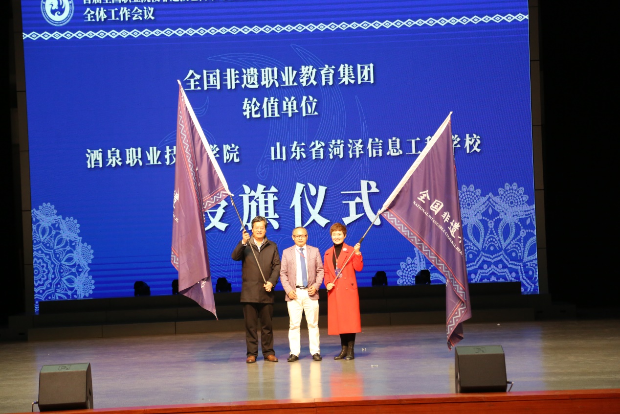 会中,全国非遗职业教育集团第一届理事会理事长陈桂林向酒泉职业技术学院和山东省菏泽信息工程学校代表授予2021年度轮值会旗,暂定2021年上半年和下半年在两所轮值学校召开年会。