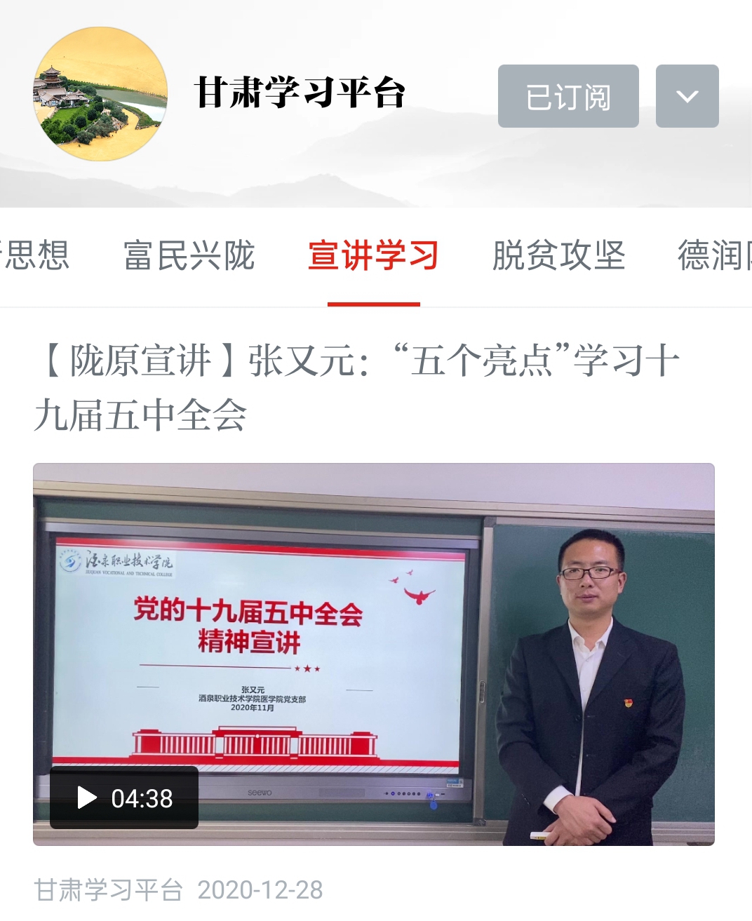 要闻快递 > 正文我校教师张又元《“五个亮点”学习十九届五中全会》宣讲视频被《学习强国》“陇原宣讲”栏目刊播