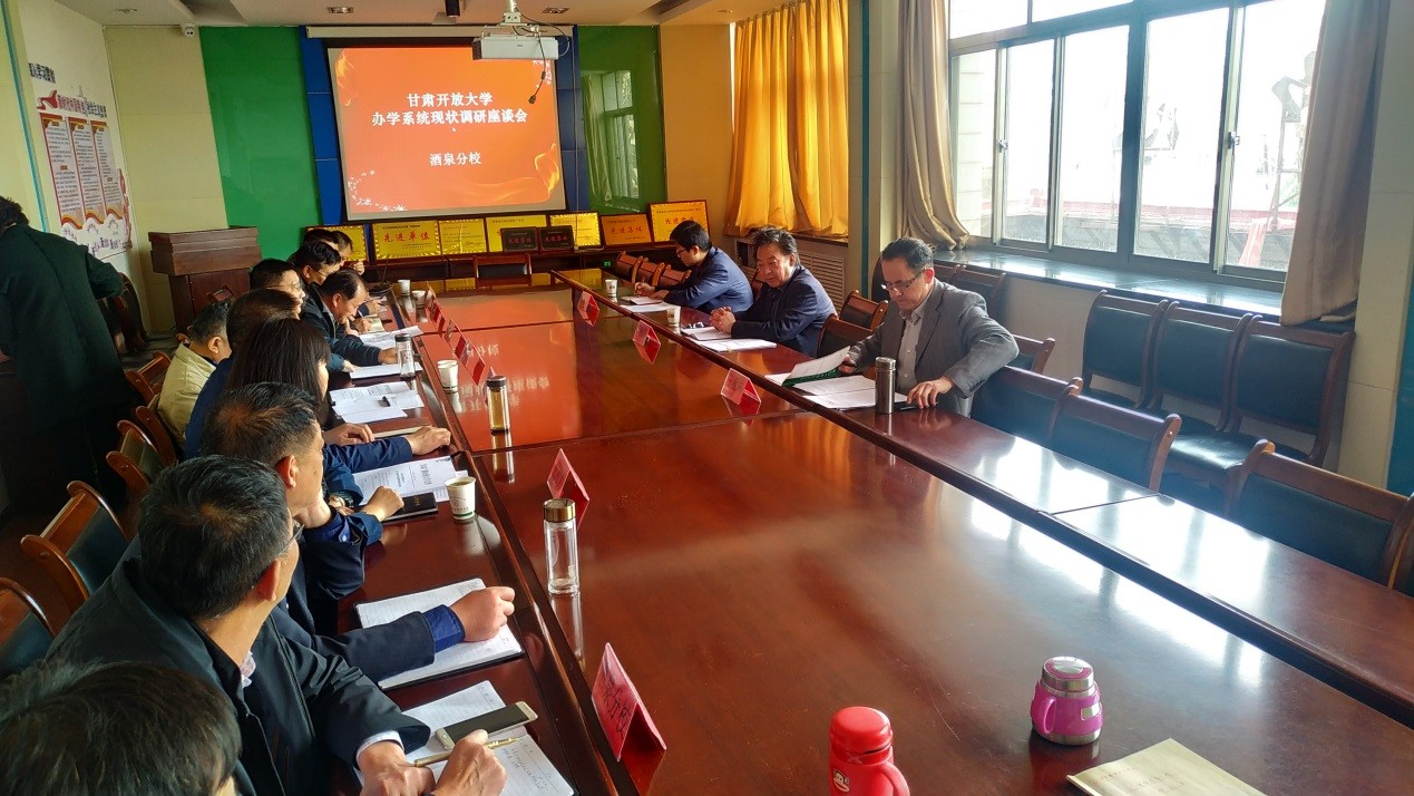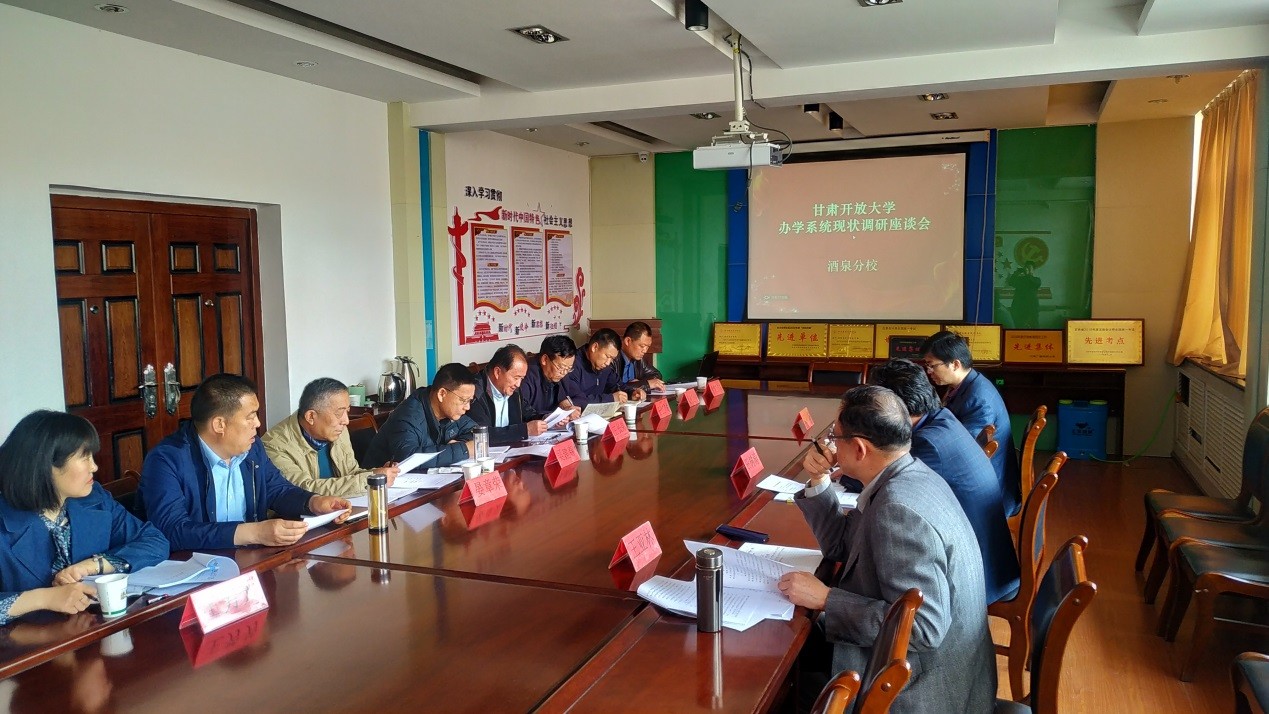 副校长王长荣就酒泉分校分校(工作站)系统建设情况、师资情况、办学体系、办学规模、办学效益及经费来源等系统现状全面对调研组做了汇报。