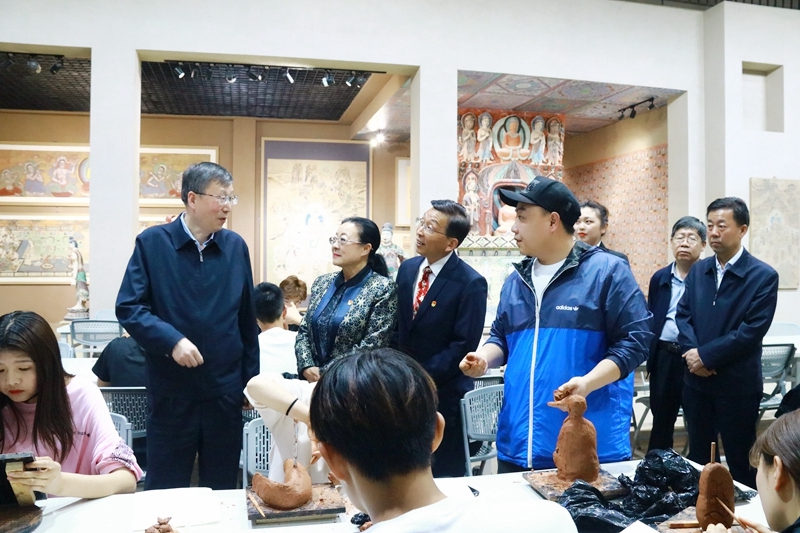 王嘉毅一行在学校党委书记、校长易志军,党委委员、副校长许军,党委委员、副校长薛仰全以及党委委员、纪委书记、监察专员魏韡的陪同下深入爱国主义教育基地、学生社团中心以及校史馆等地实地查看。在考察敦煌彩塑技艺传习所时,王嘉毅饶有兴趣地观看学生制作泥塑的过程,并不时询问材质、工艺和流程,勉励同学们戒骄戒躁,用一颗纯粹的匠心,专注、耐心地做好每一件事,做一名真正的匠者,并对我校弘扬优秀传统文化,非物质文化遗产进校园的典型做法给予了充分肯定。