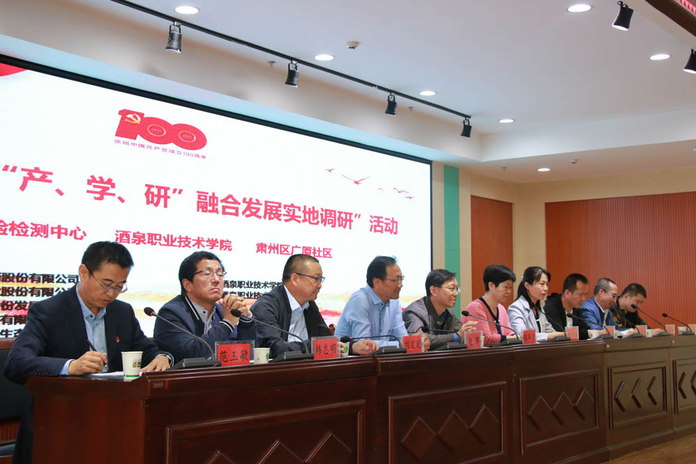 5月21日上午,酒泉市药品检验检测中心郭华荣主任、陈卫英副主任及药检中心全体党员,酒泉市肃州区广厦社区董丽娟书记,酒泉大得利制药股份有限公司党支部书记黄建德,甘肃祁连山药业股份有限公司党委书记刘定乾,甘肃莫高实业股份发展有限公司制药厂厂长蔺学智,酒泉佳禾中药材生态种植加工有限公司经理韩志明,酒泉市神舟药业有限公司质量负责人张武一行,来我校开展党史学习教育及“产、学、研”融合发展活动。酒泉职业技术学院党委委员、纪委书记、省监委派驻学校监察专员魏韡陪同。