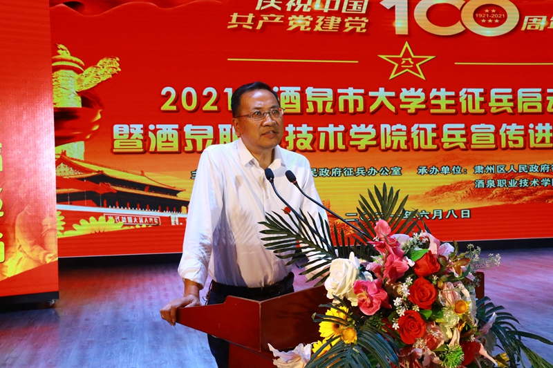 要闻快递 > 正文6月8日,2021年酒泉市大学生征兵启动仪式暨酒泉职业技术学院征兵宣传进校园活动顺利举行。酒泉市人民政府征兵办公室副主任、酒泉军分区国防动员处处长孙清波、肃州区武装部政委刘学兵、酒泉军分区动员处参谋马慧以及酒泉市征兵办公室相关人员出席宣传活动。学校党委委员、纪委书记、监察专员魏韡致辞。
