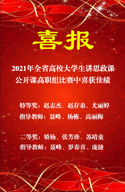 本次比赛分为本科组与高职组两个组别,共有31支高职团队、30支本科团队进入决赛,同台竞技。经过初赛、复赛的层层选拔,我校共有两支参赛队伍进入决赛。其中,赵志杰、赵存弟、尤丽婷团队的参赛作品《中国精神是民族精神和时代精神的统一》荣获2021年全省高校大学生讲思政公开课高职组比赛特等奖;矫杨、张芳珍、苏靖童团队的参赛作品《新时代我国社会主要矛盾的变化》荣获2021年全省高校大学生讲思政公开课高职组比赛二等奖。两支团队以别致的青年视角、扎实的理论积淀和生动娴熟的语言,结合建党百年、铁人精神,利用自身专业特长、精巧构思了新颖深刻的授课内容,借助音频、视频等多媒体因素,充分展现了新时代酒职学子“扎根大漠、荫泽苍生”的精神风貌。