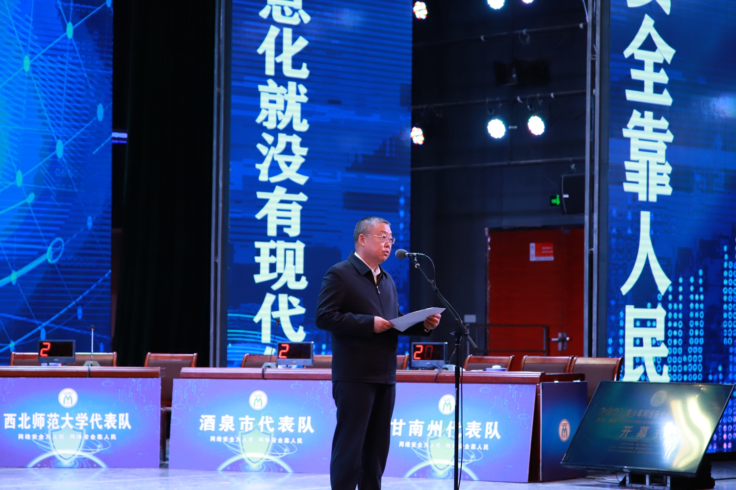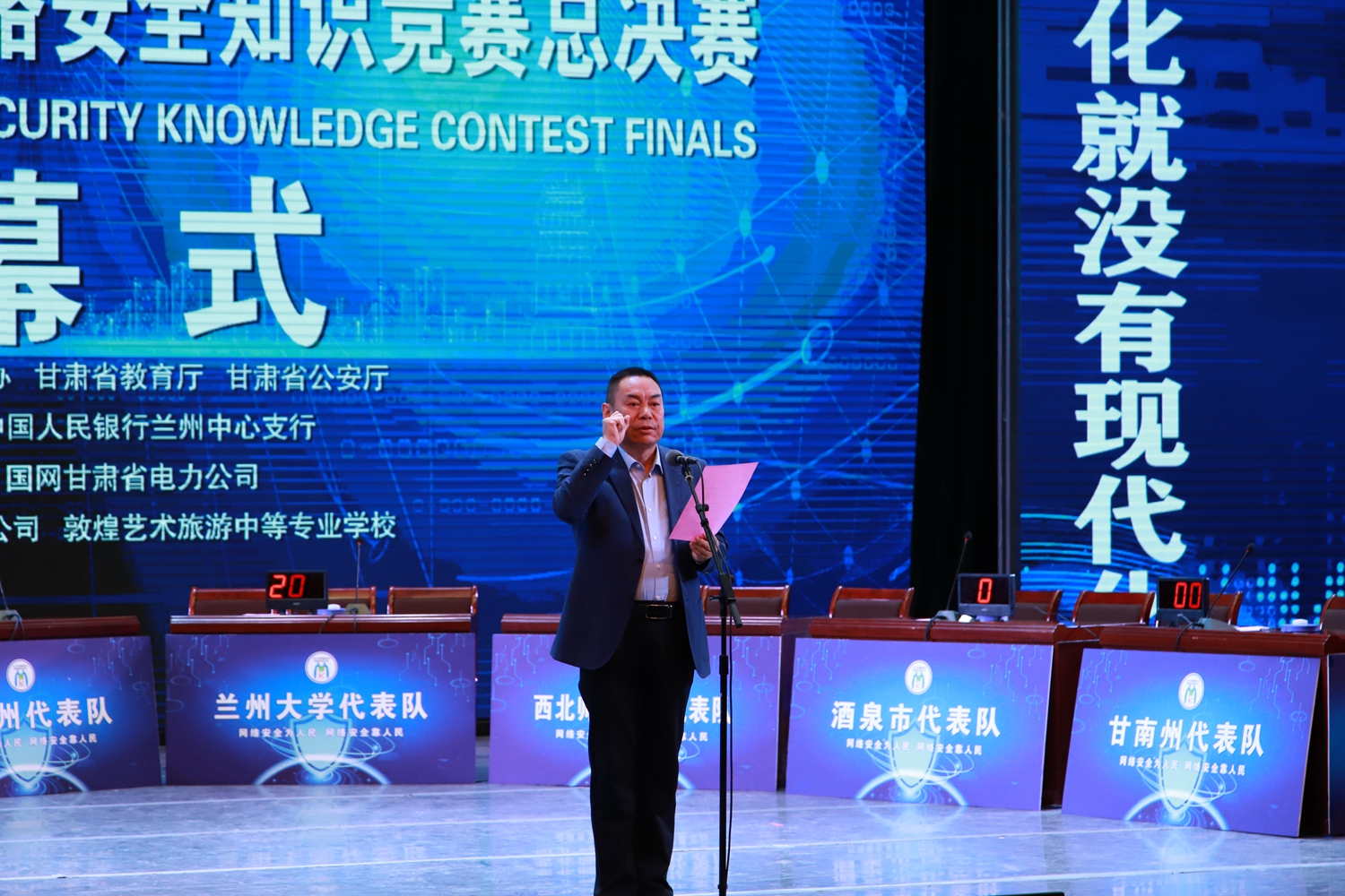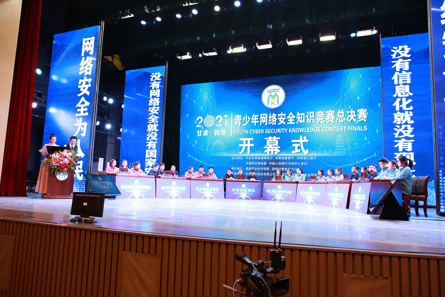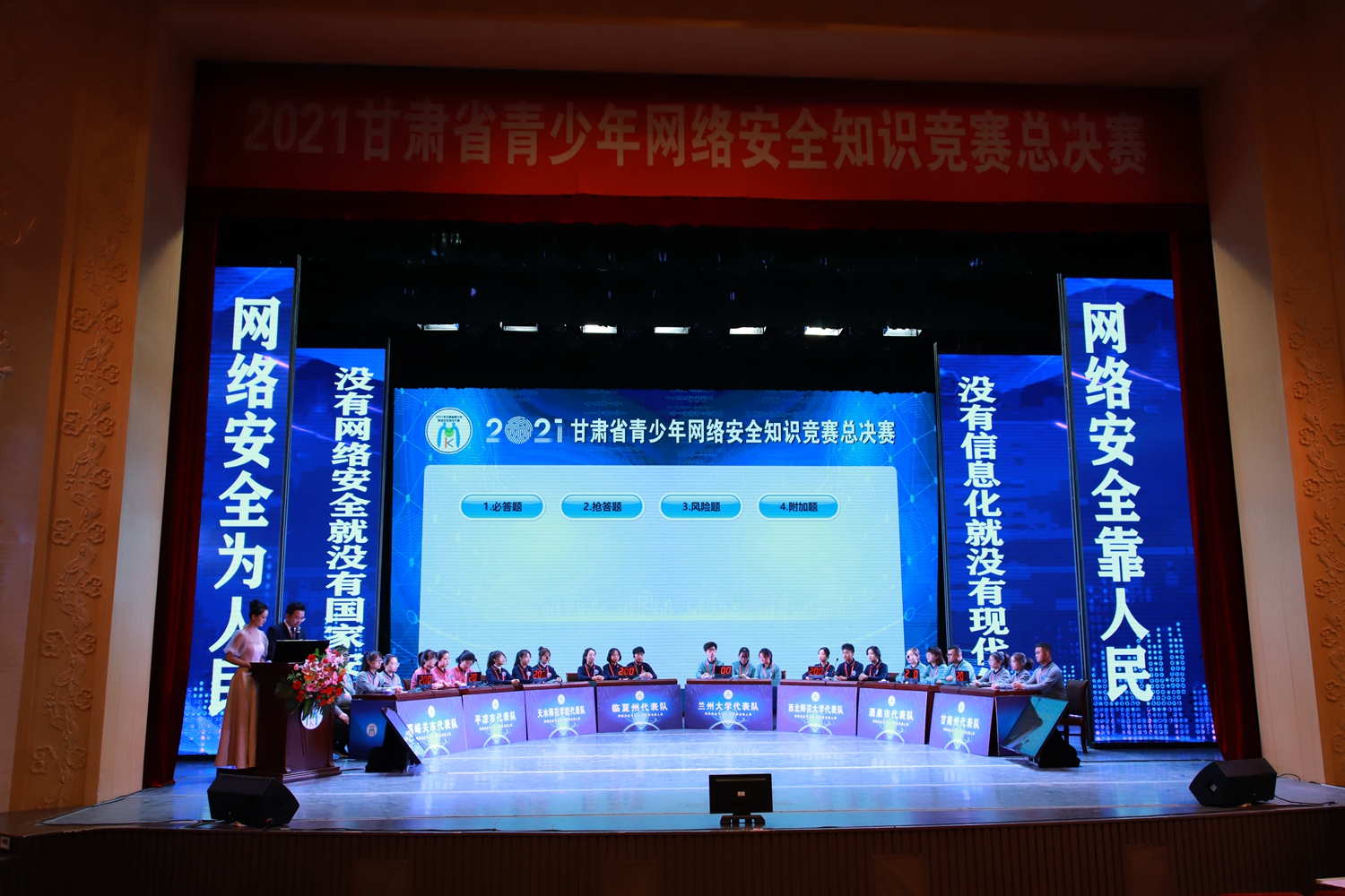 要闻快递 > 正文为深入宣传贯彻习近平总书记关于网络强国的重要思想,激发全省广大青少年学习网络安全知识的积极性,提升广大青少年网络安全意识和基本防护技能。10月9日,由中共甘肃省委网信办、甘肃省教育厅、甘肃省公安厅、共青团甘肃省委、中国人民银行兰州中心支行主办,酒泉职业技术学院、国网甘肃省电力公司承办的2021年甘肃省青少年网络安全知识竞赛总决赛在敦煌市飞天剧院成功举办。省委网信办副主任刘宗礼、省委网信办网络管理执法处处长冯乐泉、省电化教育中心主任包磊、省公安厅网络安全保卫总队一级调研员张生顺、共青团省委宣传部副部长徐杰、酒泉职业技术学院党委副书记许军、中国人民银行兰州中心支行科技处副调研员童深以及国网甘肃省电力公司电科院副院长马志程等领导出席活动。