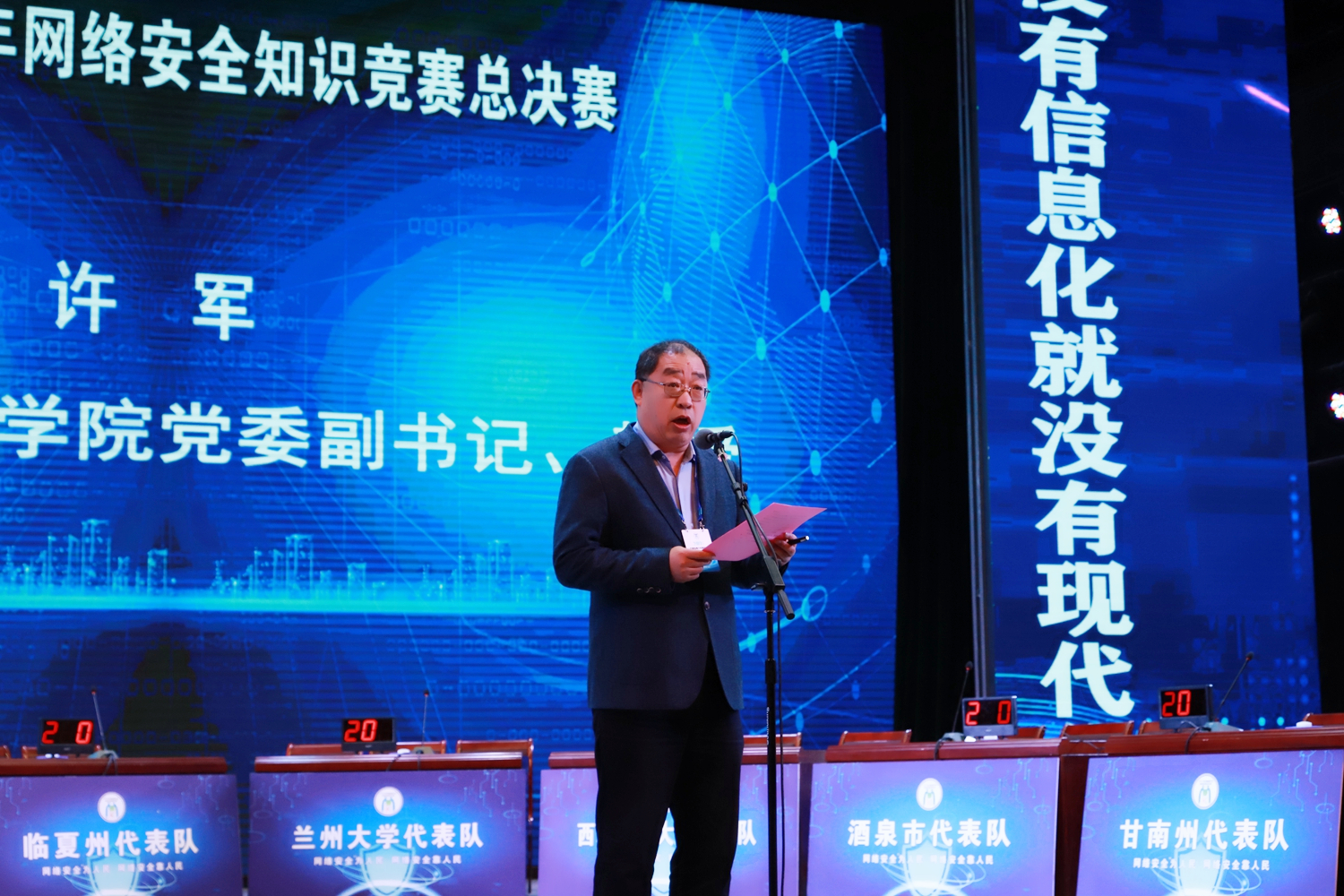 酒泉职业技术学院党委副书记许军教授致辞,他表示维护网络安全、规范网络秩序、净化网络环境是全社会的共同责任,需要大家共同参与,共同筑牢网络安全防线。全面普及网络安全知识、提升广大青少年群体网络安全意识和防护能力,培养网络强国建设者和接班人,意义重大且任重道远,希望各参赛队员冷静思考,沉着应战,赛出水平、赛出风格,取得优异成绩。