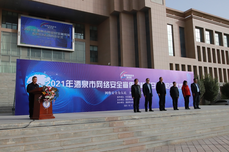10月12日,2021年酒泉市网络安全宣传周“校园日”活动启动仪式在我校举行。市委教育工委委员、市教育局党组成员、副局长陶英江,市公安局调研员裴继生、酒泉职业技术学院党委副书记许军以及酒泉卫生学校、酒泉工贸中专和市教育发展服务中心等相关负责人出席启动仪式。学校党委委员、副校长王立智主持仪式。