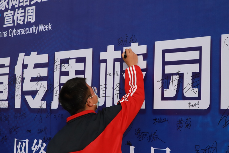 网络文明志愿者代表宣读了倡议书,参会领导和师生进行了“网络安全为人民,网络安全靠人民”主题签名,并发放了宣传资料。