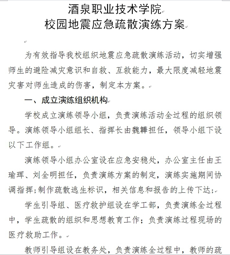 为了保障此次地震应急疏散演练顺利开展,学校制定了全面、详细的实施方案和应急预案,成立了演练组织机构,由演练领导小组负责演练活动全过程的组织领导,下设了学生引导组、医疗救护组、教师引导组和宣传组等工作小组,专项负责演练活动各环节的顺利开展。根据每个部门各自制定的演练分预案,学校制定了演练总预案,进行了分时段、分场地模拟演练11场次,并在每次演练结束后进行总结分析,及时进行改进。
