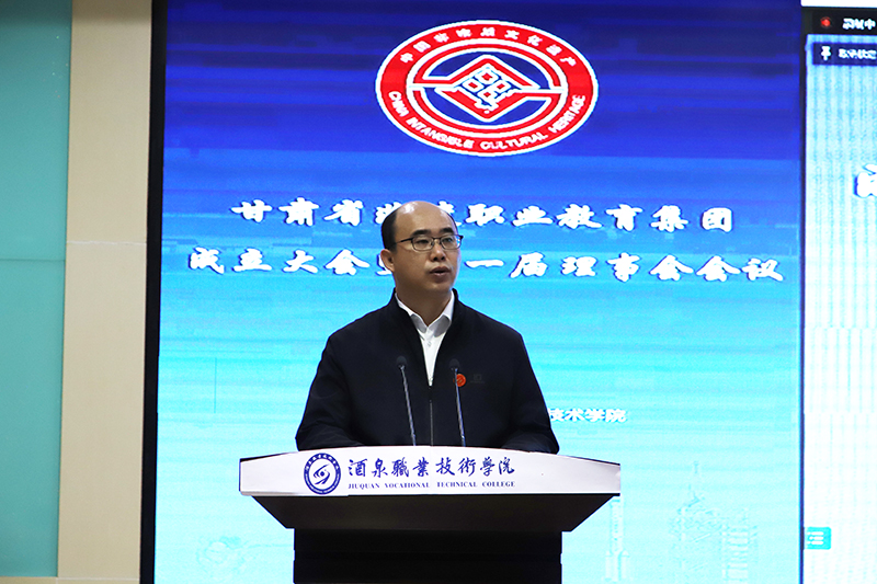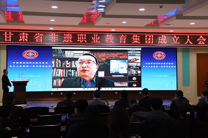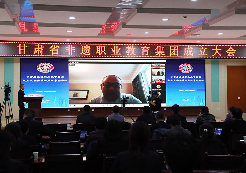 要闻快递 > 正文为进一步优化职业教育资源配置,做大做强非遗职业教育,提升职业教育为中华优秀传统文化和非遗技艺传承人才培养服务能力。12月24日,甘肃省非遗职业教育集团成立大会暨第一届理事会会议在酒泉职业技术学院采取线上线下的方式召开。全国非遗职教集团理事长陈桂林教授、甘肃省文旅厅非遗保护中心主任刘卫华线上参加会议;酒泉市文体广电和旅游局副局长马宗岭、酒泉职业技术学院党委书记、校长易志军及党委委员、副校长吴建春等领导出席会议。酒泉职业技术学院党委委员、副校长王立智主持会议。