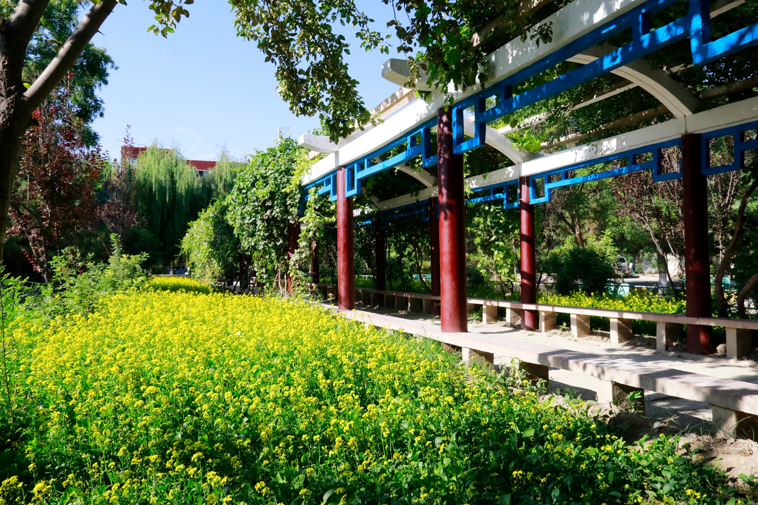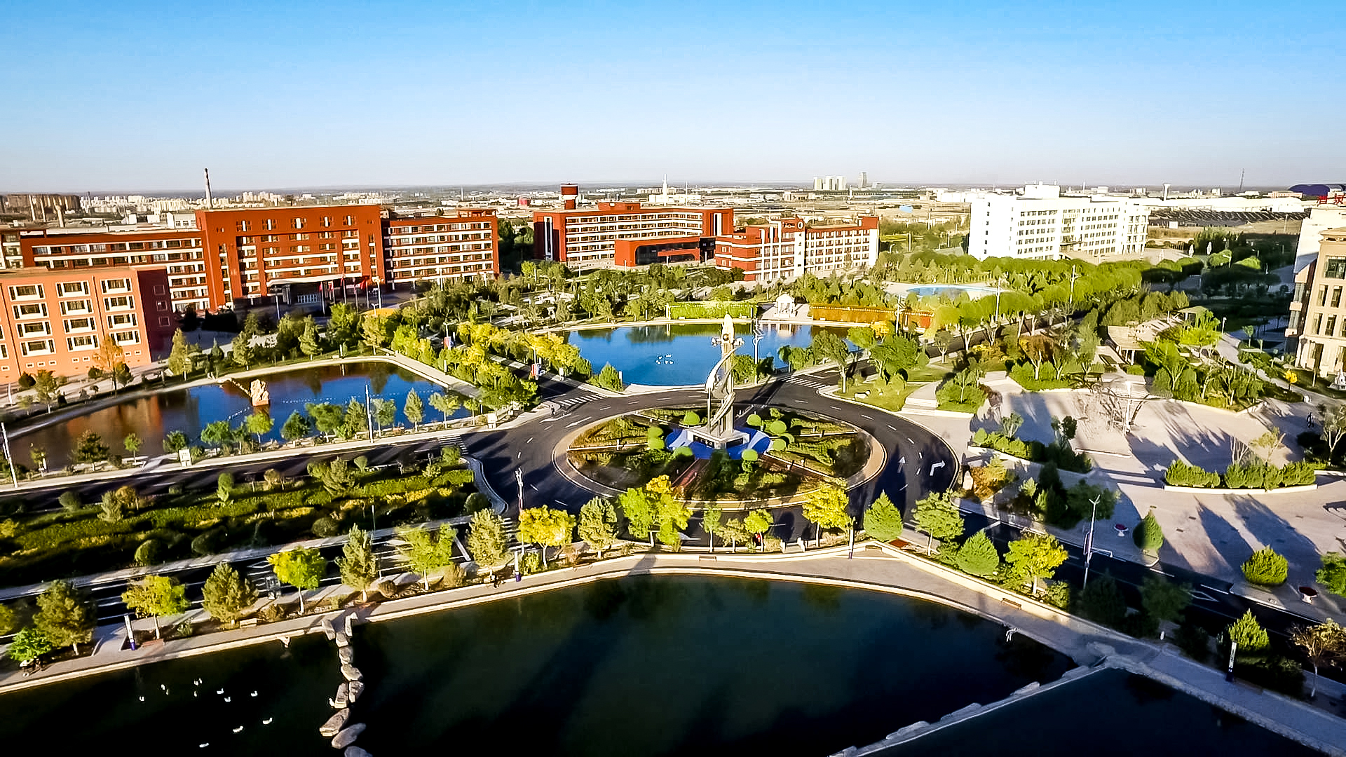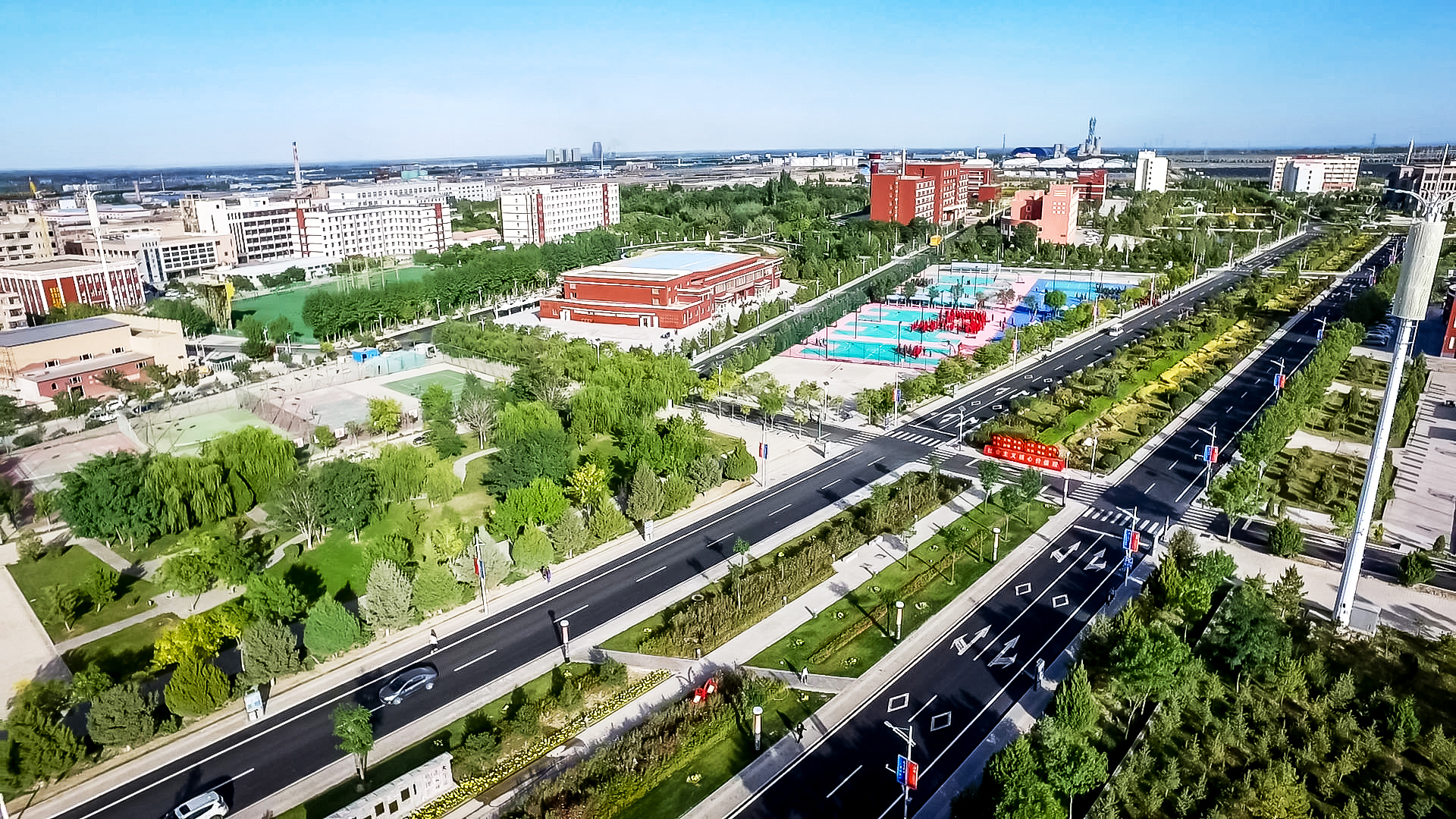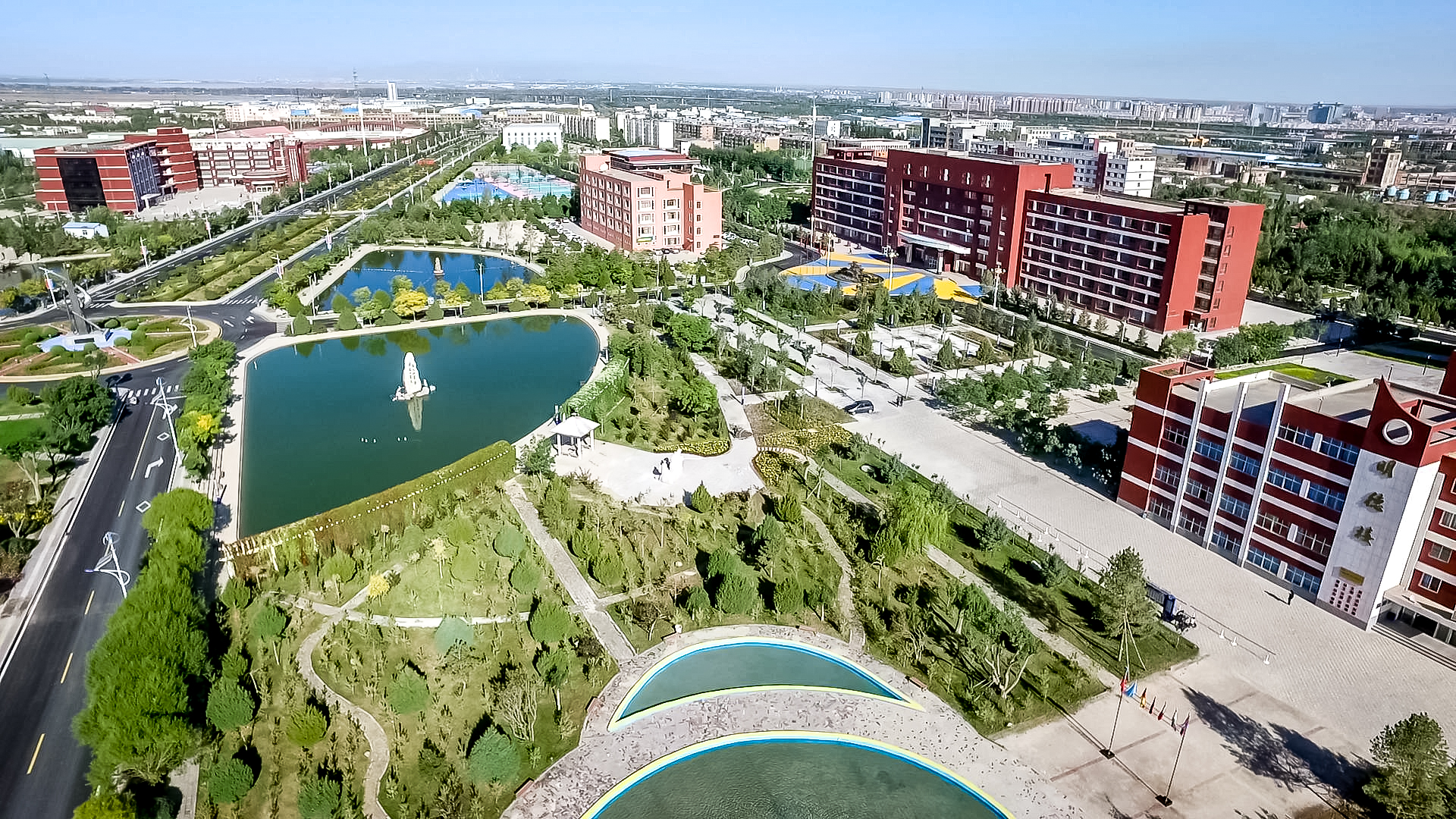 新校区自搬迁以来,学校每年都开展义务植树,绿化校园,累计投入4000多万元,绿化覆盖率占校园使用面积一半以上,将昔日的戈壁荒滩变成了草木菁菁、碧水盈盈、花香四溢、亭台楼阁的园林式校园,一座座建筑次第展开,一簇簇花朵竞相开放,玲珑的假山、曲折的回廊、别致的小品,一景一品遥相呼应,浑然一体,展示着生命的顽强和生机,深刻诠释了为党育人、为国育才的初心和使命。