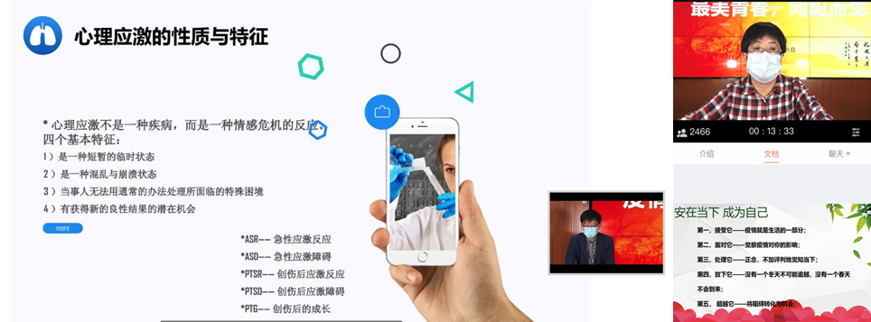本次讲座中,主讲老师围绕学校闭环管理的原因,疫情期间可能存在的各种生活、情绪问题,如何进行自我心理调节等方面展开,指出了同学们的心理误区以及错误应对手段,针对当前疫情给学生带来了心理和学习上的影响,有的放矢,教授学生处理情绪的基本技巧,引导学生在疫情期间与情绪友好相处,适应并改善自我学习方式、生活节奏,并建议同学们当自己无法应对时应积极寻求专业帮助。