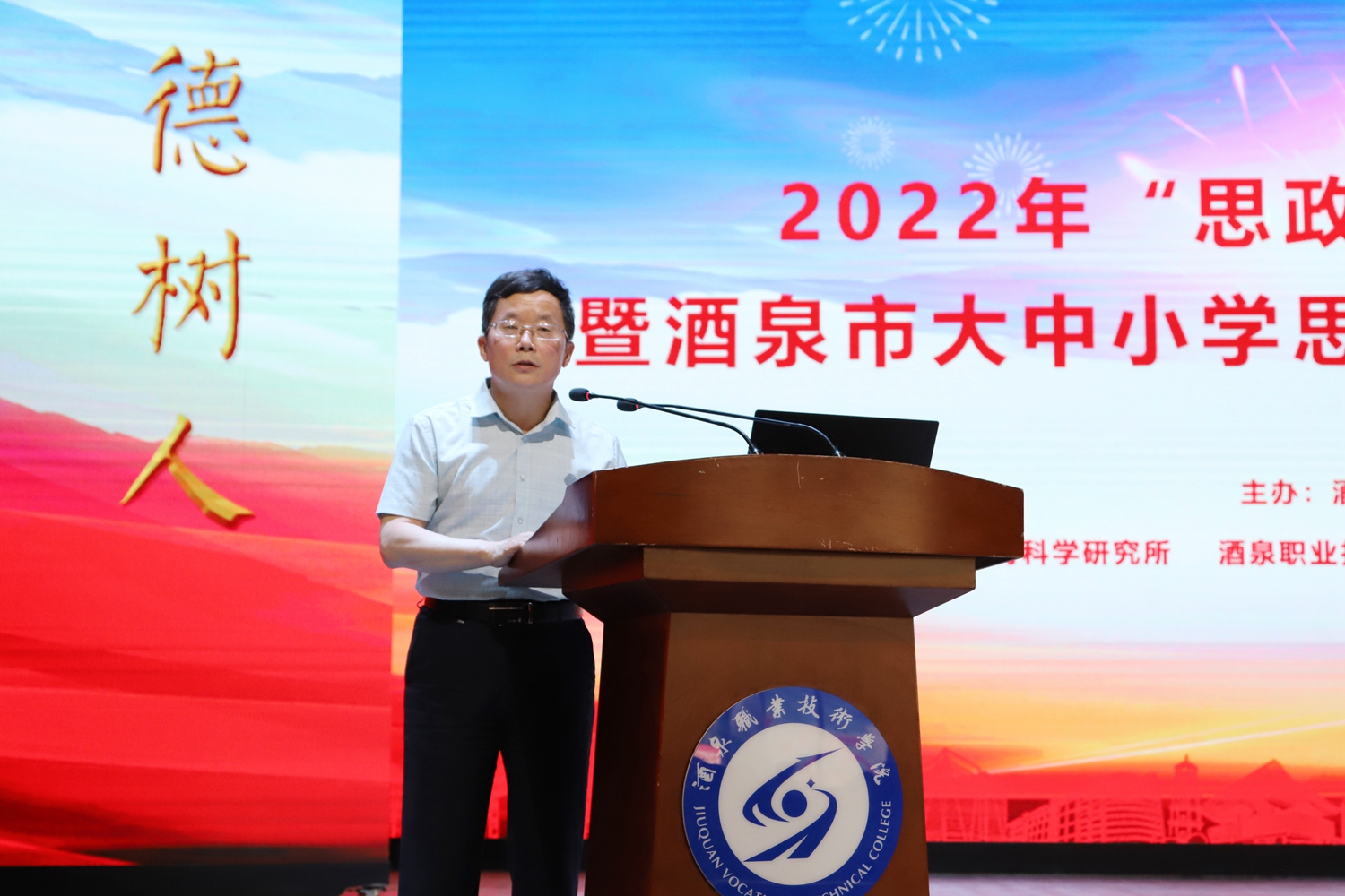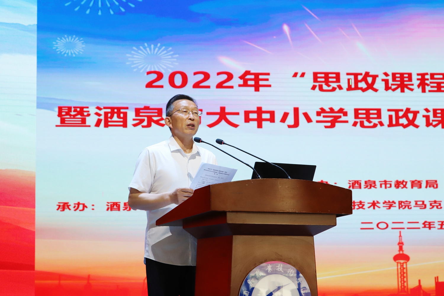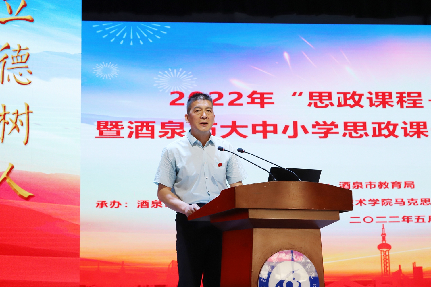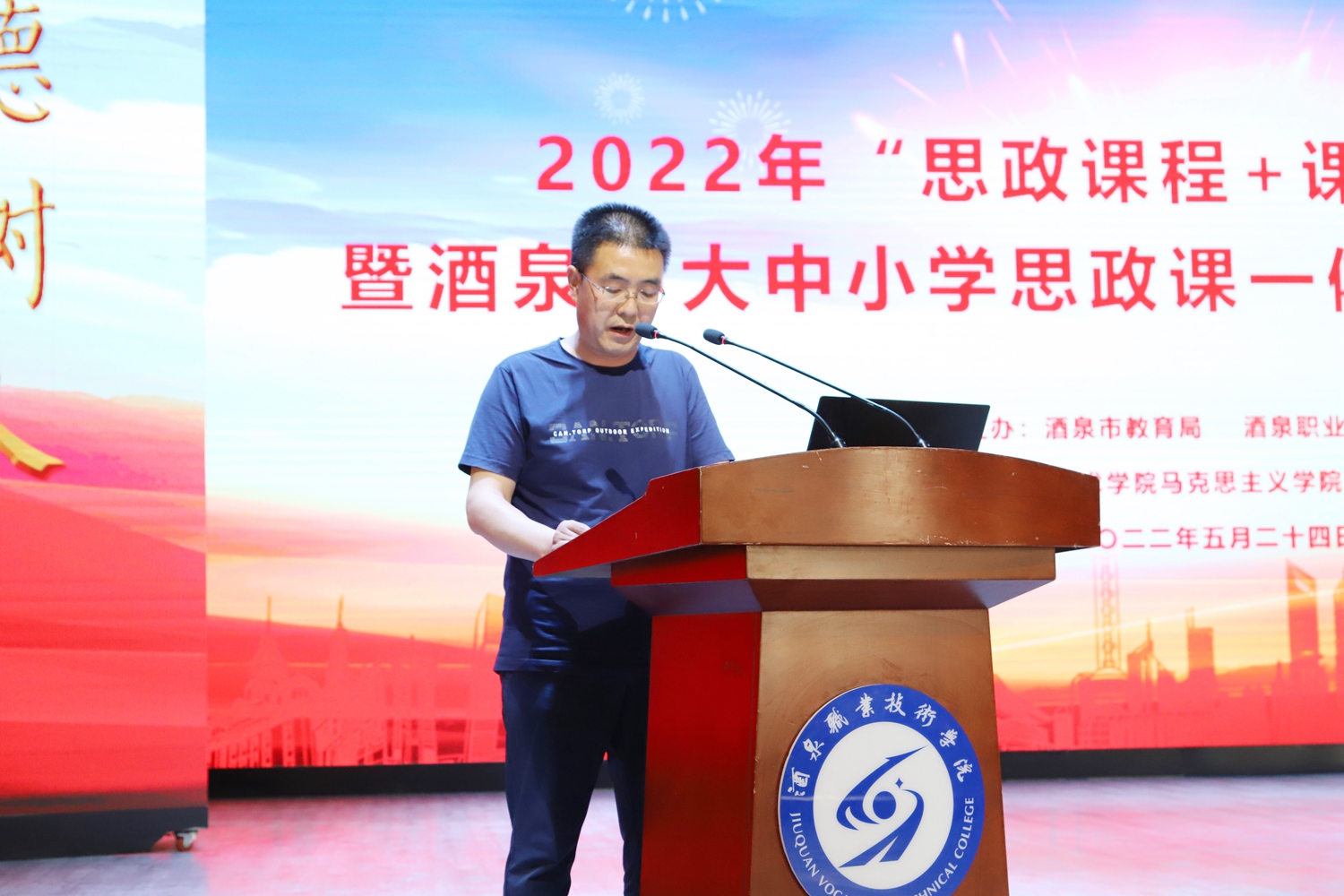 要闻快递 > 正文为深入贯彻习近平总书记在学校思想政治理论课教师座谈会上重要讲话精神,落实中共中央办公厅、国务院办公厅《关于深化新时代学校思想政治理论课改革创新的若干意见》,加强酒泉市大中小学思政课一体化建设,推进思政课程与课程思政协同育人,5月24日,2022年“思政课程+课程思政”论坛暨酒泉市大中小学思政课一体化建设研讨会在酒泉职业技术学院举办。酒泉市教育局党组成员、副局长、酒泉市大中小学思政课一体化建设指导委员会副主任委员陶英江,酒泉职业技术学院党委书记、校长,酒泉市大中小学思政课一体化建设指导委员会副主任委员易志军等出席会议。酒泉职业技术学院党委副书记许军主持会议。