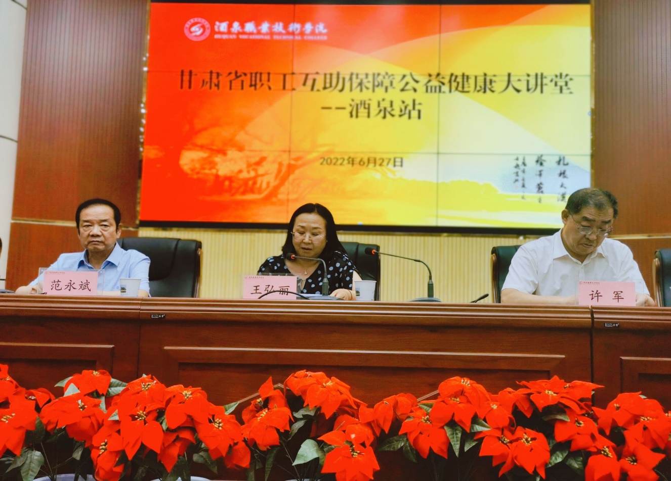 为充分发挥职工互助保障组织在促进职工健康教育方面的重要作用,传播自信、积极、乐观、向上的理念,引导职工快乐工作、健康生活,打通“服务职工的最后一公里”。6月27日,市总工会一级调研员王弘丽、酒泉市人民医院健康管理中心主任范永斌教授一行4人来我校开展职工互助保障公益健康宣讲,学校党委副书记许军同志和全校教职工代表100余人参加。