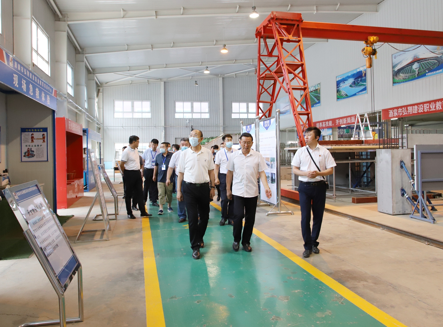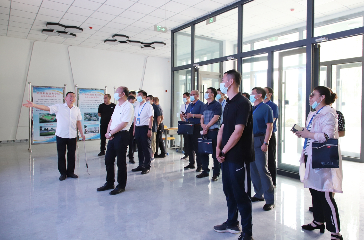 培训班学员在党委书记、校长易志军,党委副书记许军的陪同下详细了解了酒泉市职业教育产教融合示范区规划布局、建设方案、项目建设推进等情况,实地查看了青少年创新实践中心和3号实训楼在建项目建设情况,格物楼、工科实训中心、敦煌彩塑技艺传习所及光伏电厂等场地,了解了学校实验实训条件、人才培养和校园文化建设等情况,对我校职业教育典型经验和创新举措进行了重点考察。易志军表示希望以此次考察交流为契机,双方加强沟通和交流,寻求合作空间,互通理念、互相促进,携手共赢,推动学校发展再上新台阶。