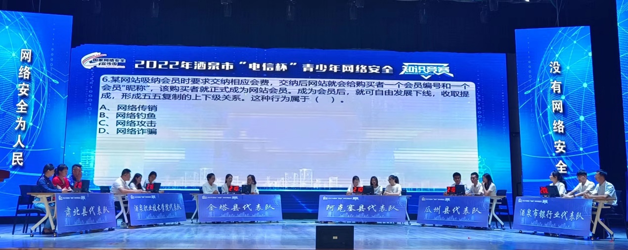 本次决赛,我校师生与来自各县区的7支队伍:肃州区、金塔县、玉门市、瓜州县、敦煌市、肃北县、阿克塞县的以及4支市直单位代表队:市教育局、市公安局、共青团酒泉市委、中国人民银行酒泉市中心支行共12支代表队同台竞技。通过必答题、抢答题、风险题、加时题四个竞赛环节的激烈比拼。竞赛中,各代表队按照竞赛规则,冷静沉着、胸有成竹、对答如流、竞相角逐,上演了一场精彩激烈的比赛,展现了扎实的知识功底和良好的网络素养,展示了奋发进取、昂扬向上的精神风貌,赛出风格,赛出水平,赢得现场阵阵掌声。