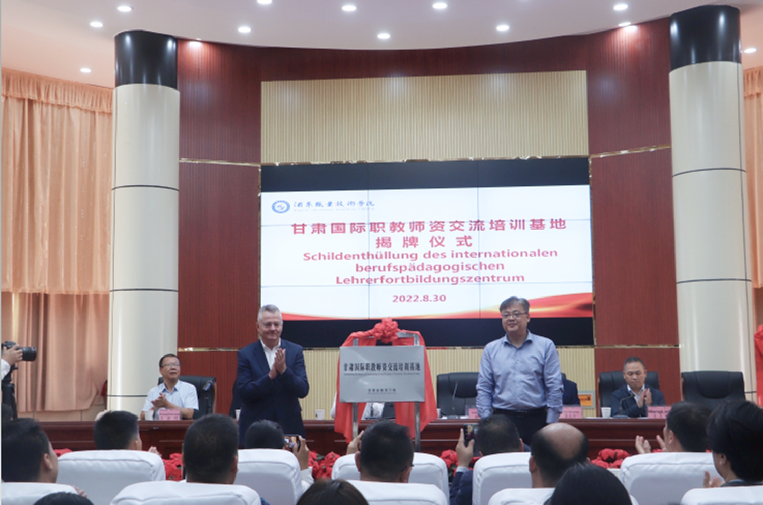 要闻快递 > 正文2022年8月30日上午,学校在逸夫报告厅隆重举办“甘肃国际职教师资交流培训基地”“德国专家流动工作站”“新能源能力中心”“学前教育能力中心”揭牌暨赛会西部项目负责人魏博先生离任仪式。 德国汉斯·赛德尔基金会甘肃代表处首席代表福尔克·魏博及其夫人尤塔布·魏博、酒泉市教育局副局长邹志平、酒泉职业技术学院党委书记、校长易志军、学校党委党员、宣传统战部部长王金明、外事办,教师发展中心、各二级学院负责人及学生代表参加会议。学校党委委员、副校长王立智主持仪式。