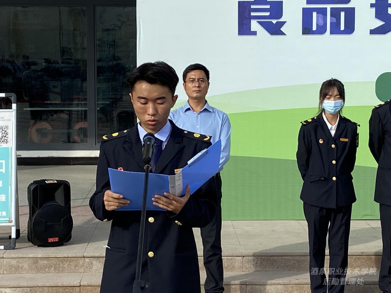 酒泉市市场监督管理局餐饮科科长卢成元宣读了《食品安全倡议书》,飞天餐厅业主张丽代表学校餐饮服务窗口作承诺发言,韩义凡同学代表校学生会进行了发言。