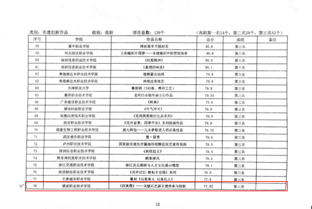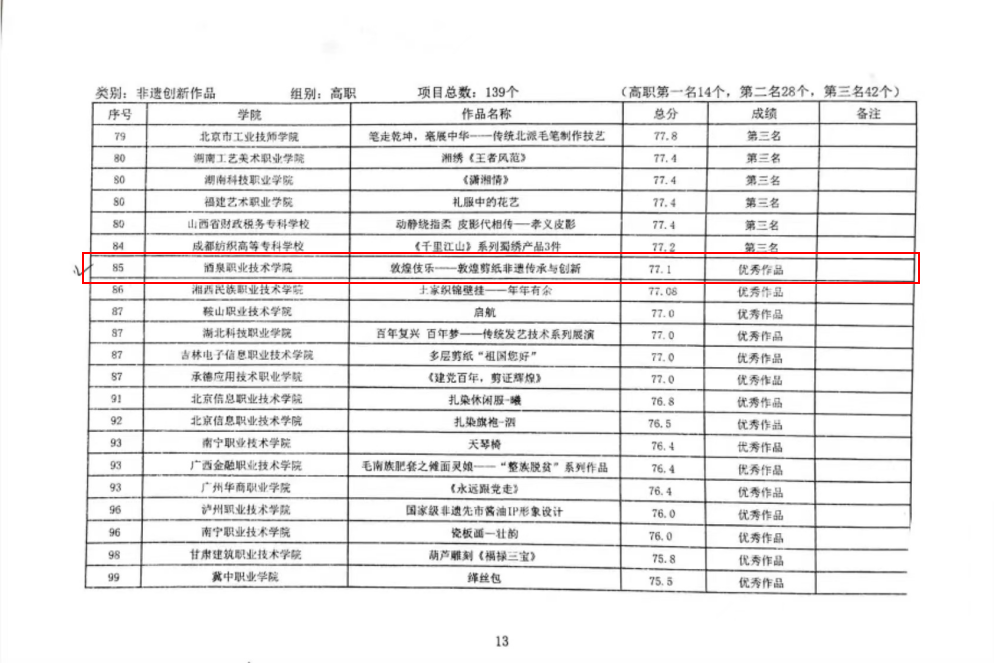 近日,由教育部等单位指导,中华职业教育社主办的第三届“黄炎培杯”中华职业教育非遗创新大赛暨非遗职业教育成果展示会通过线上形式顺利举办,全国27个省(区、市)、 140余所职业院校的443个项目参加本届大赛,我校参赛的4个项目,《酒泉玉樽- 夜光杯雕非遗传承与创新》获得一等奖;《四美图——戈壁石艺画非遗传承与创新》获得三等奖;《敦煌伎乐——敦煌剪纸非遗传承与创新》、《圆梦飞天—-敦煌面塑非遗传承与创新》获得优秀奖;《高职“敦煌非遗+”育人模式实践与研究》获得非遗教学成果二等奖。