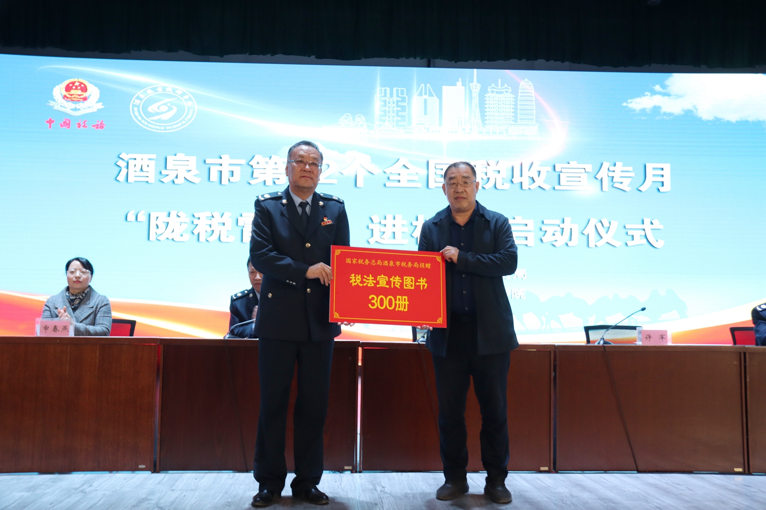 酒泉市税务局向学校捐赠图书,并向大学生税法宣传志愿服务队授旗。
