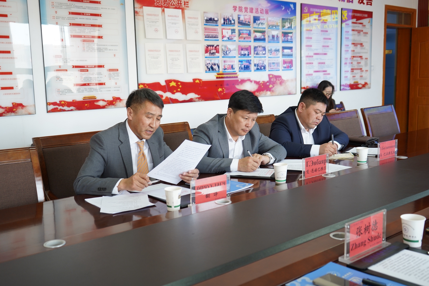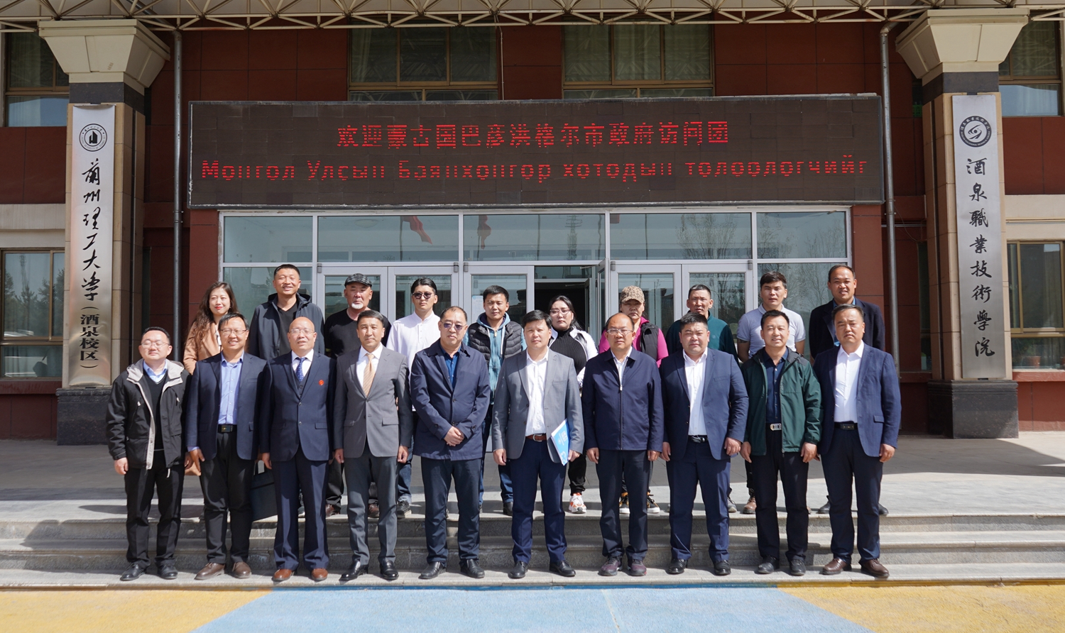 要闻快递 > 正文4月8日,蒙古国巴彦洪格尔市市长嘎·恩赫巴雅尔、蒙古国巴彦洪格尔省食品与农业局局长乌·巴拉津尼玛带领相关人员来我校考察交流。酒泉市外事办主任曹广成、副主任刘万文等相关领导出席座谈会。酒泉职业技术学院党委副书记许军、党委委员、副校长施荣参加会议。