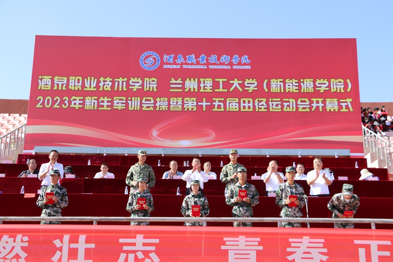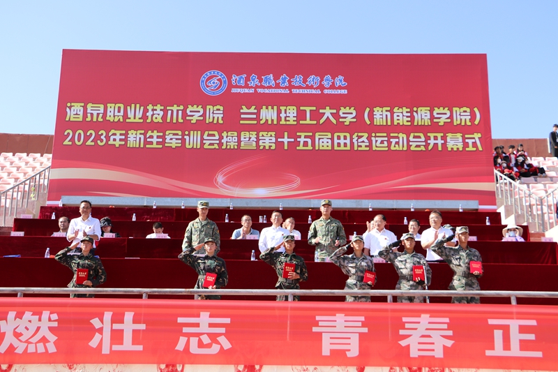 要闻快递 > 正文金秋九月,秋高气爽。9月20日,学校举行酒泉职业技术学院、兰州理工大学新能源学院2023级新生军训会操暨第十五届田径运动会开幕式,共同检阅2023级新生军训成果。西部战区96111部队某部营长王亮亮少校、酒泉职业技术学院党委书记、校长易志军,党委委员、副校长王立智,党委委员、副校长王长荣,党委委员、纪委书记、监察专员魏韡以及兰州理工大学新能源学院党委书记王胜强出席活动。党委委员、副校长施荣主持活动。