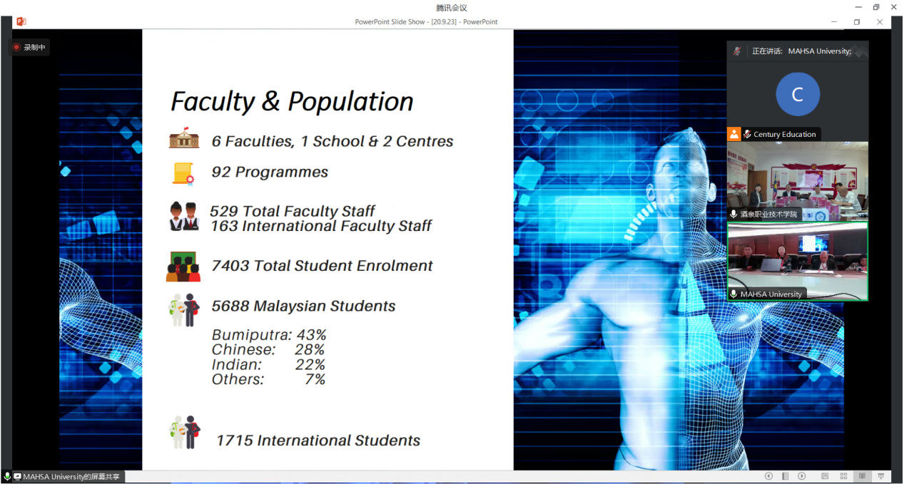 玛莎大学校长Professor Dato’ Dr. Ikram Shah Bin Ismail介绍了玛莎大学的基本情况。玛莎大学是马来西亚的重点大学,是东南亚地区医学、生物科学、健康科学、商业教育重要学术机构之一 ,同时也是公认的海外重点大学之一。