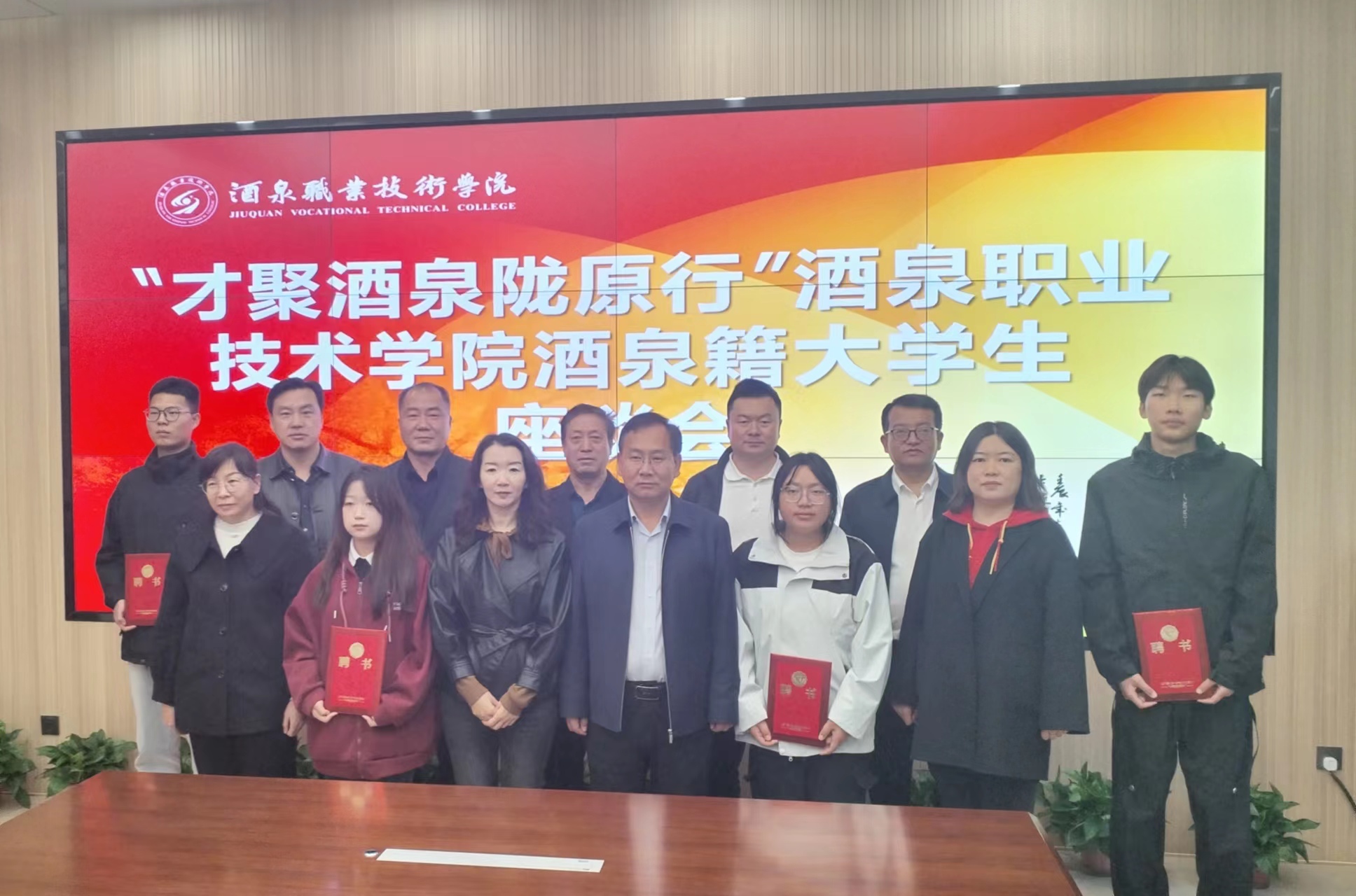 座谈会上,学校党委委员、副校长施荣代表学校致欢迎辞,并介绍了我校发展概况、专业设置、人才培养、实习就业、“双高”建设及创建职业技术大学等相关情况。酒泉市人才中心副主任桃花对学校一直以来为酒泉市社会、经济发展所做的巨大贡献表示衷心的感谢,并向与会师生介绍了酒泉市社会经济发展和人才需求情况;酒泉市人力资源和社会保障局四级调研员王志成就酒泉市毕业生就业创业十条政策进行了详细解读,并认真解答了学生的相关提问。座谈会现场气氛热烈,酒泉籍生源学生纷纷表达了毕业后回乡就业创业的意愿。酒泉市人社局还选聘我校4名优秀学生作为酒泉市“招才引智联络员”并颁发聘书。座谈会由党委委员、副校长施荣主持,酒泉市人力资源和社会保障局、酒泉市人才中心、酒泉市各县(区)人才中心和我校招生就业处领导及20多名酒泉籍学生代表参加。
