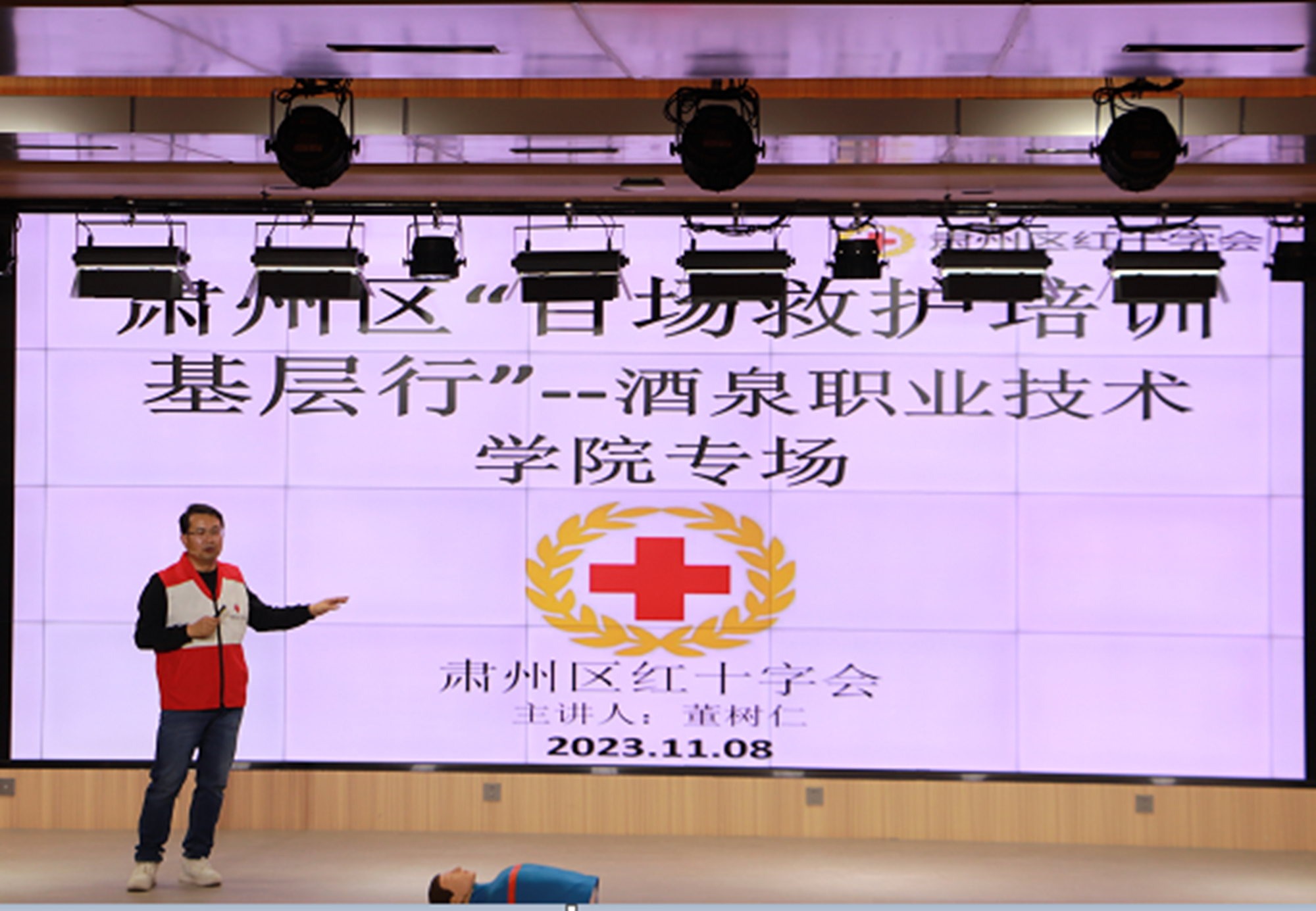 为有效落实省、市、区卫健委“百场救护培训基层行”活动要求,大力开展师生中常见的突发疾病、意外伤害等情况下自救、互救基本知识、基本技能陪训普及,切实提高突发疾病、意外伤害的急救成功率,11月8日晚,学校邀请肃州区卫健委、肃州区红十字会对全校师生做了普及性“救护培训”。学校230人在弘毅楼闻道厅主会场参加了培训,各二级学院教学班级在所在教室通过直播观看了培训。
