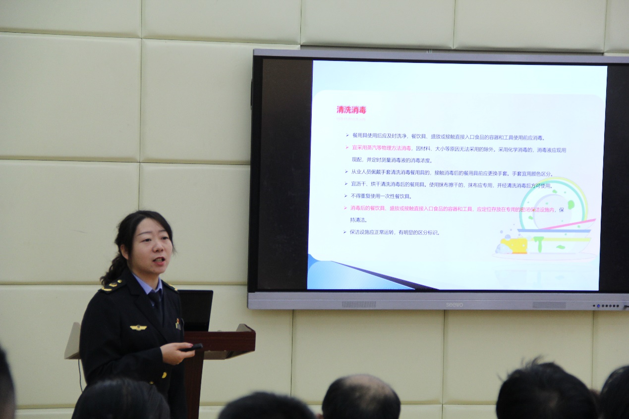 市场监督管理局经开区监管科科长李倩进行了详细全面的食品安全培训,主要就食品安全法规、食品储存与加工的卫生要求、食物中毒的预防与处理、典型案例等方面的知识进行了生动的讲解。商户们认真听讲,积极互动,纷纷表示受益匪浅。