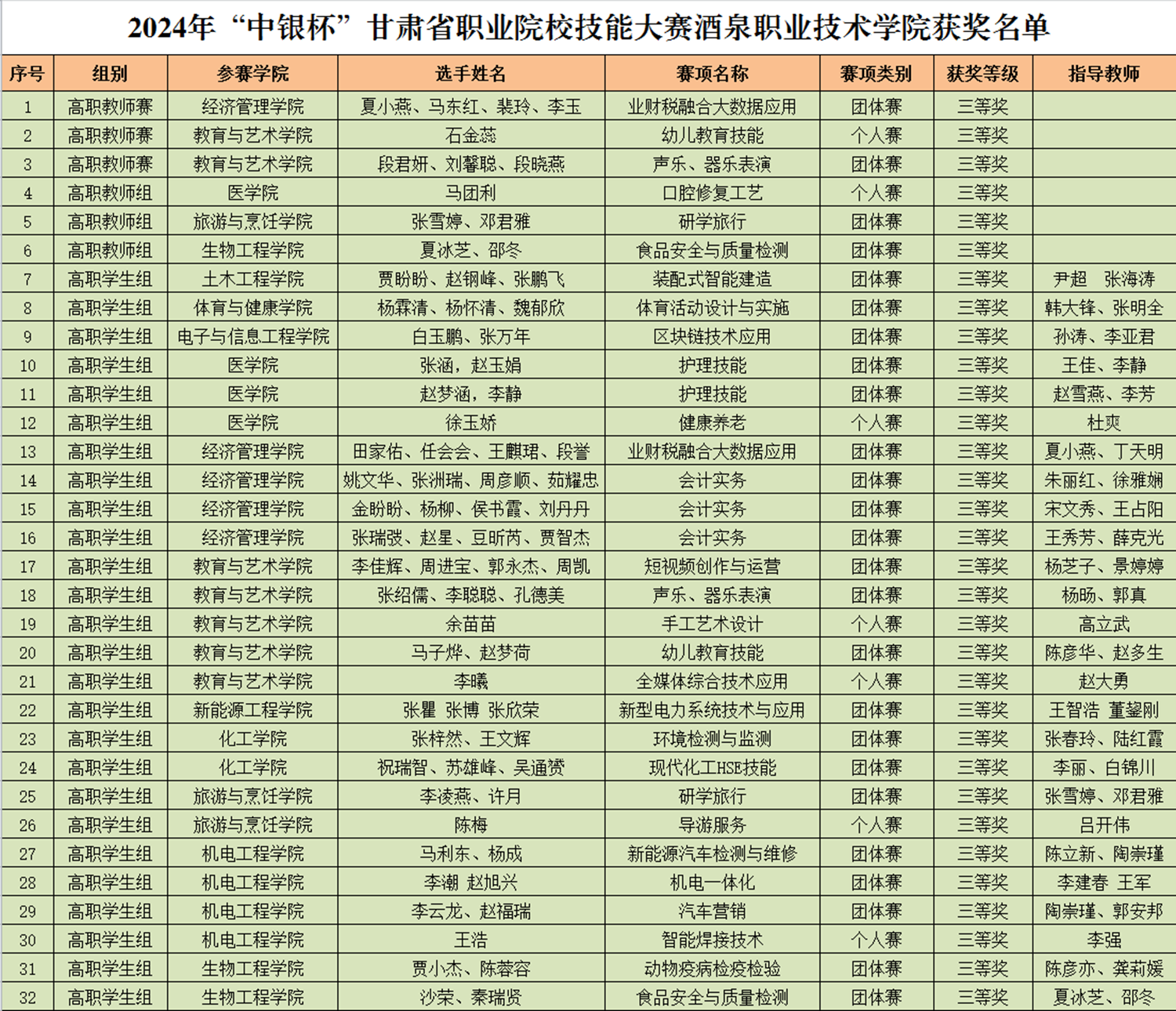 要闻快递 > 正文2024年“中银杯”甘肃省职业院校技能大赛于1月20日圆满落幕。本届大赛共有全省29所高职院校、1所技师学院、119所中等职业学校、23所技工学校的7992名学生、1334名教师,在全省24个赛点17个大类165个赛项中进行技能比拼。我校共派出199名学生、32名教师参加51个赛项的比赛,经过紧张激烈的角逐,共获得一等奖13项,二等奖20项,三等奖32项的优异成绩。其中化工生产技术、生物技术、智能焊接技术、酒水服务、研学旅行、水利工程BIM建模与应用、市政管线(道)数字化施工、地理空间采集与处理、建筑信息模型建模于应用与新型电力系统技术与应用等10个赛项拟获得2024年全国职业院校技能大赛的参赛资格。