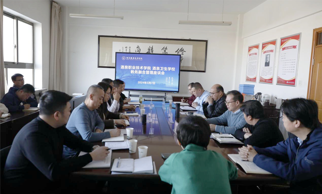 2024年3月8日下午,在学校行知楼三楼会议室召开了酒泉职业技术学院、酒泉卫生学校教务融合管理座谈会。酒泉职业技术学院教务处处长杨洁、教务处副处长陈学红、招生就业处副处长张晓彬、教师发展中心副主任赵大勇、医学院副院长于荣哉与酒泉卫生学校党委委员、副校长孙俊峰、教务科科长王志锐及两校教务工作人员参加座谈会。座谈会由酒泉职业技术学院教务处副处长王军主持。