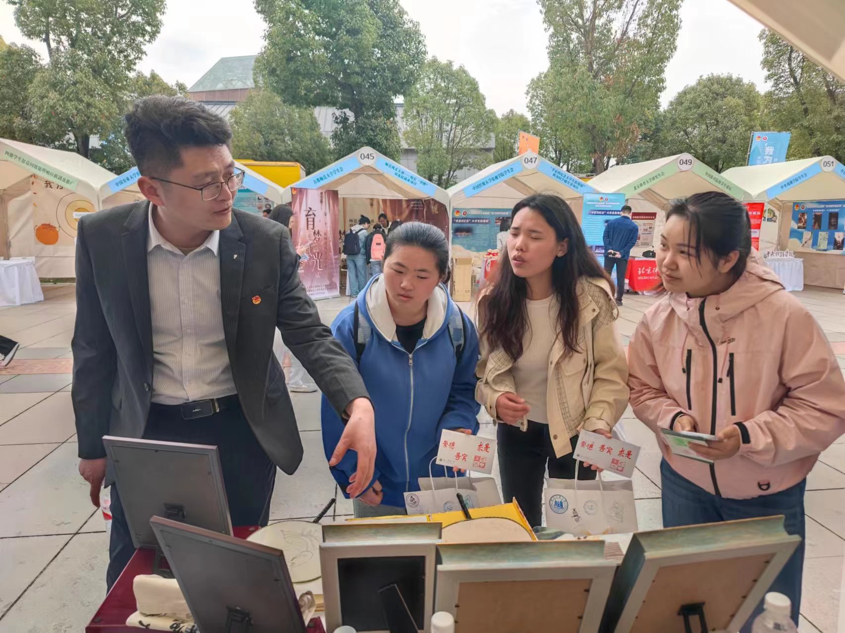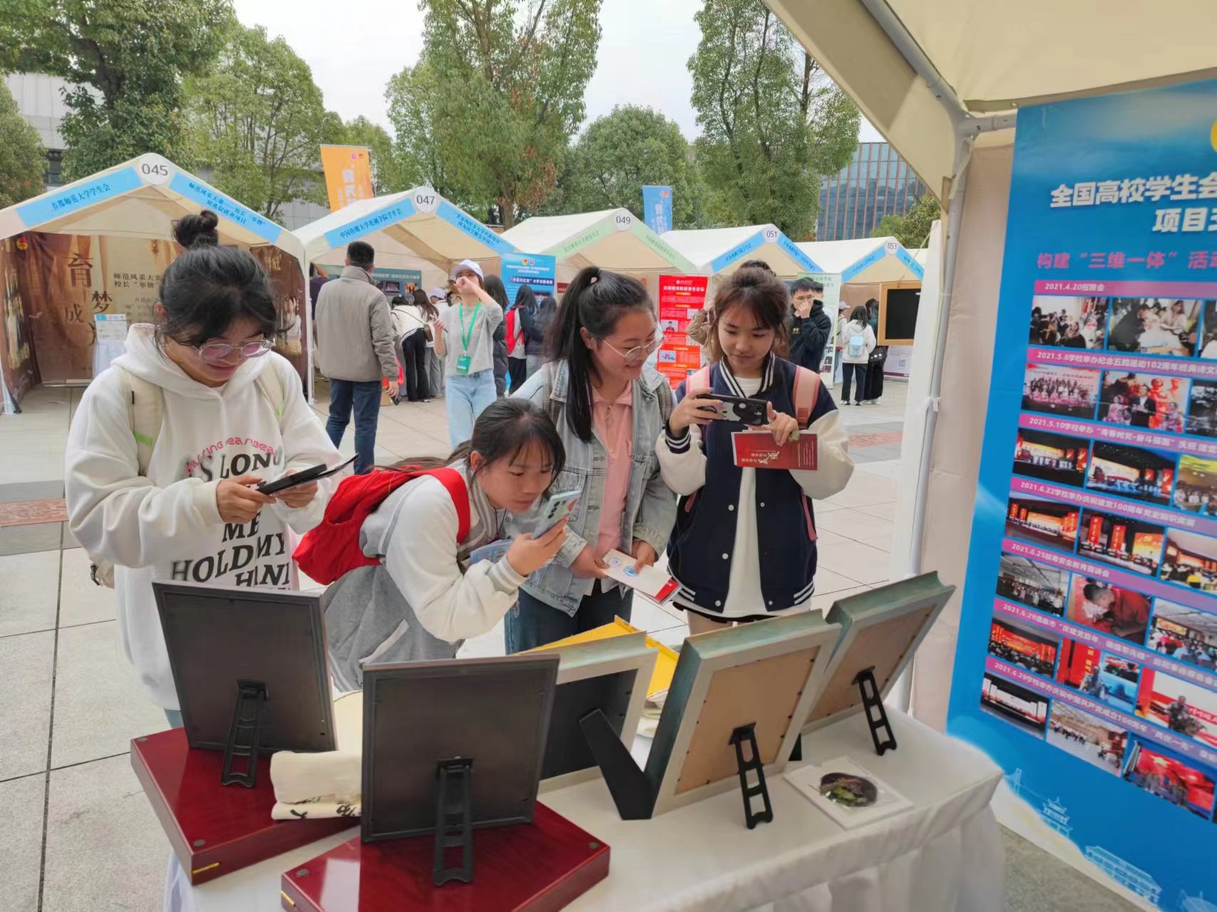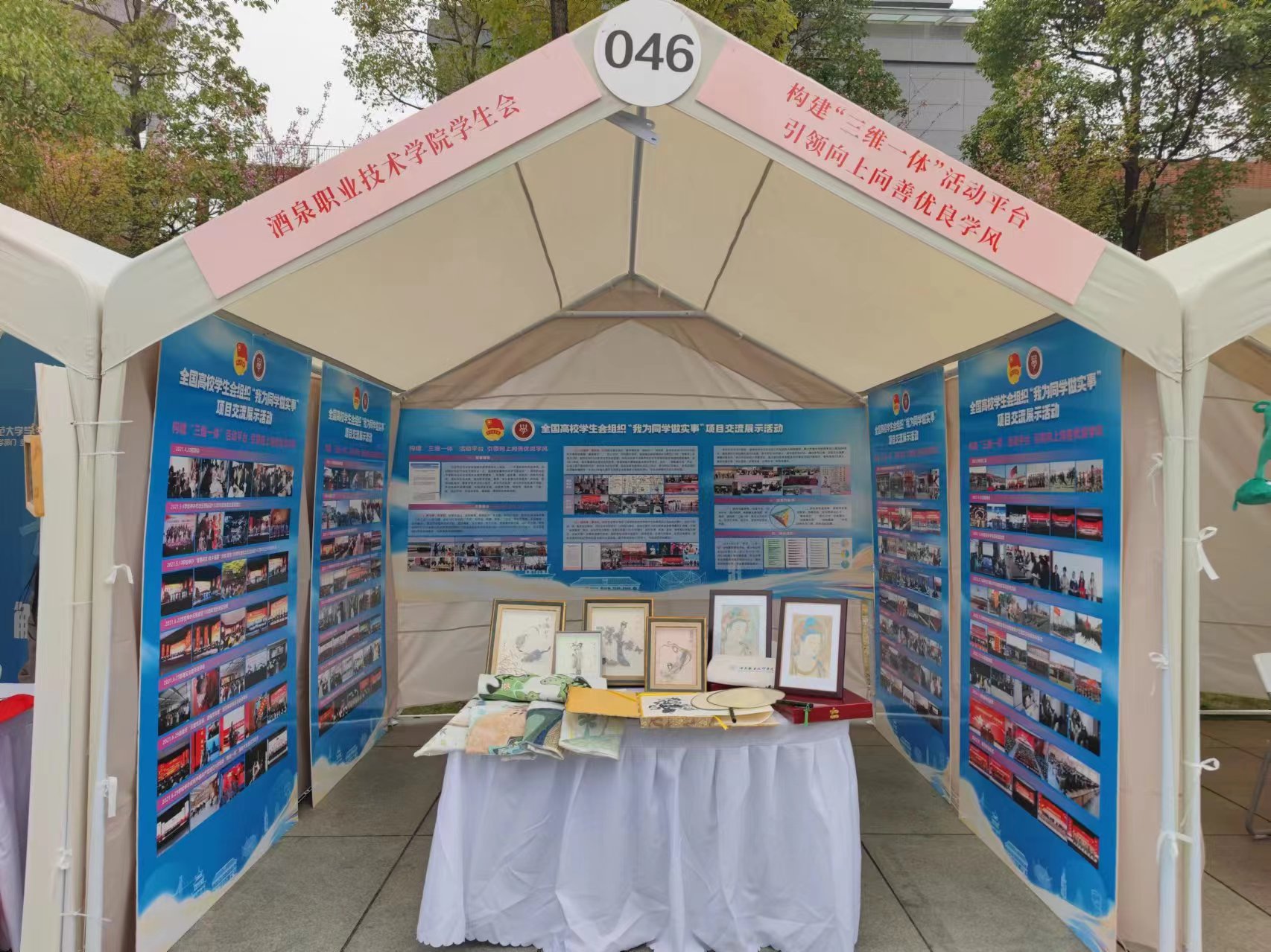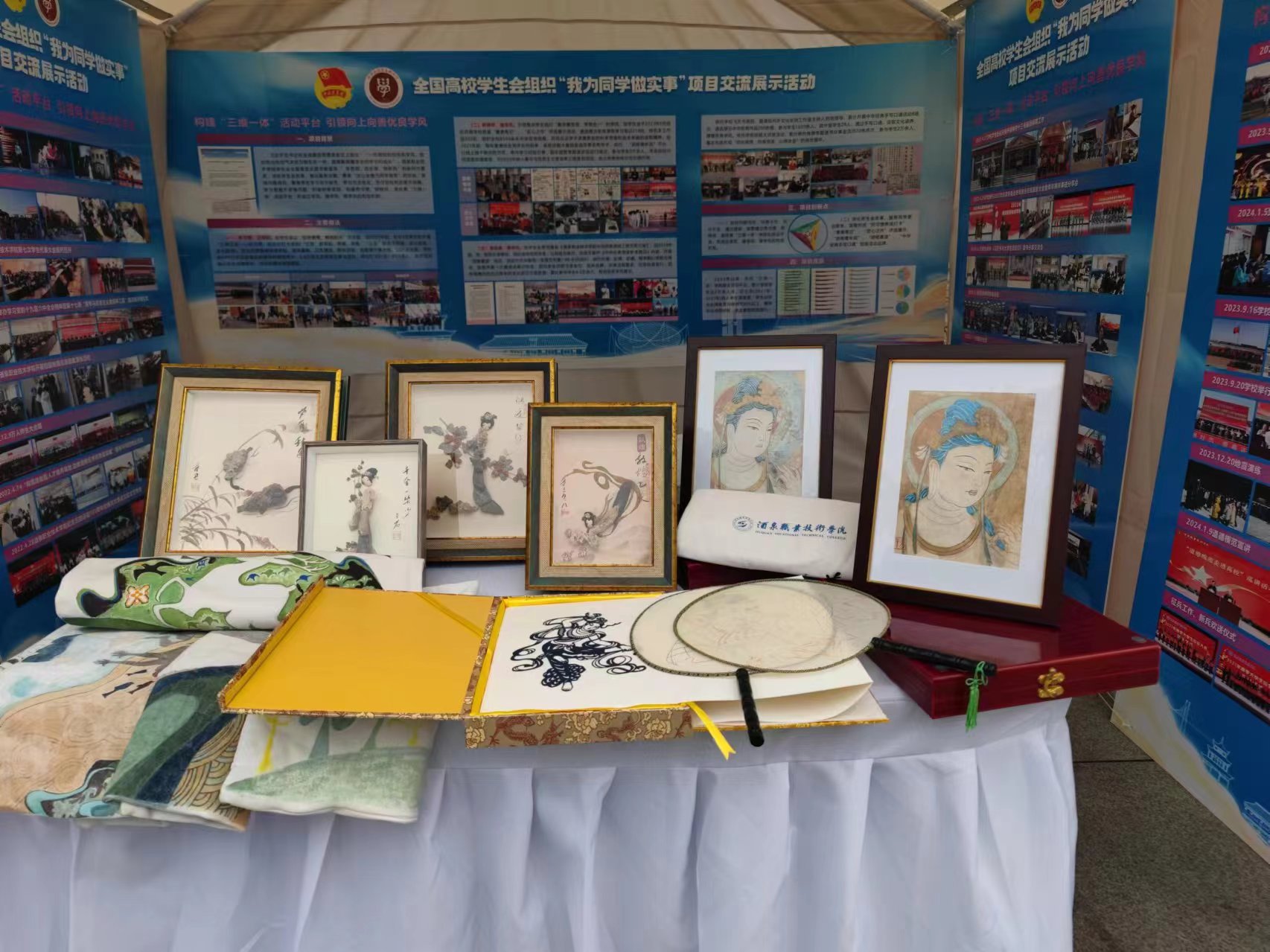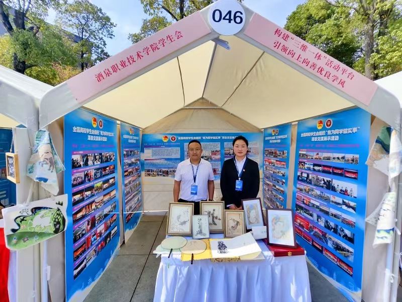 活动展示现场,我校项目团队经过前期精心筹备,以“再现敦煌”专业文创作品、精美展板为依托,展示我校学生会通过构建“三维一体”学风建设平台(养习惯、树榜样、读经典),引领向上向善学风的核心内容与育人成效,展位吸引了众多师生参与互动并交流互学。