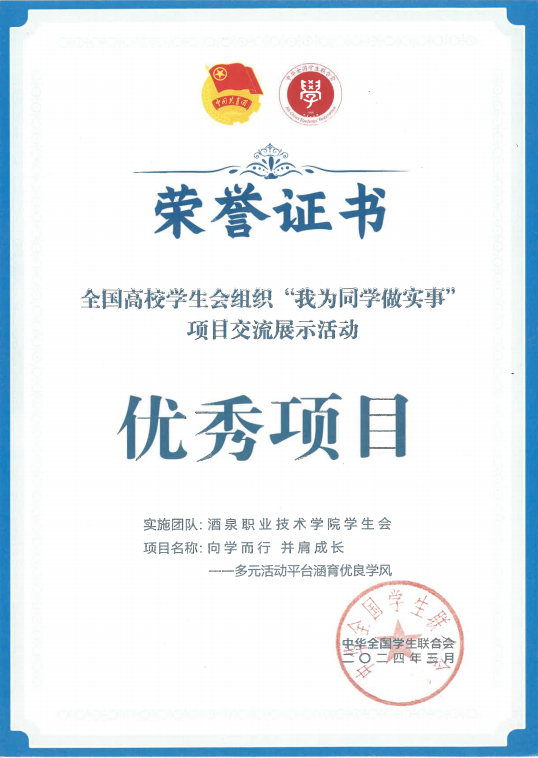 经学校自荐、省级推报、全国遴选和现场答辩,我校“向学而行 并肩成长--多元活动平台涵育优良学风”项目从1724所高校的3581个项目中脱颖而出,获评全国高校学生会组织“我为同学做实事”项目交流展示活动优秀项目。