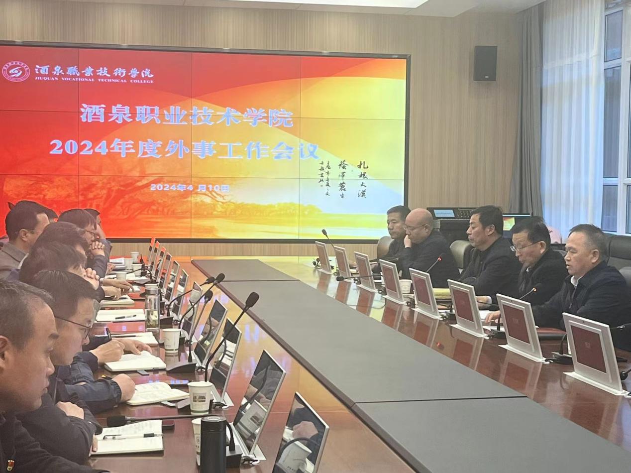 2024年4月10日,酒泉职业技术学院2024年度外事工作会议在弘毅楼A106会议室召开,学校党委书记、校长、校外事工作领导小组组长易志军出席会议并讲话,校外事工作领导小组成员、各二级学院主要负责人以及国际交流处、国际交流学院全体成员参加了会议。会议由校党委委员、副校长王立智主持。