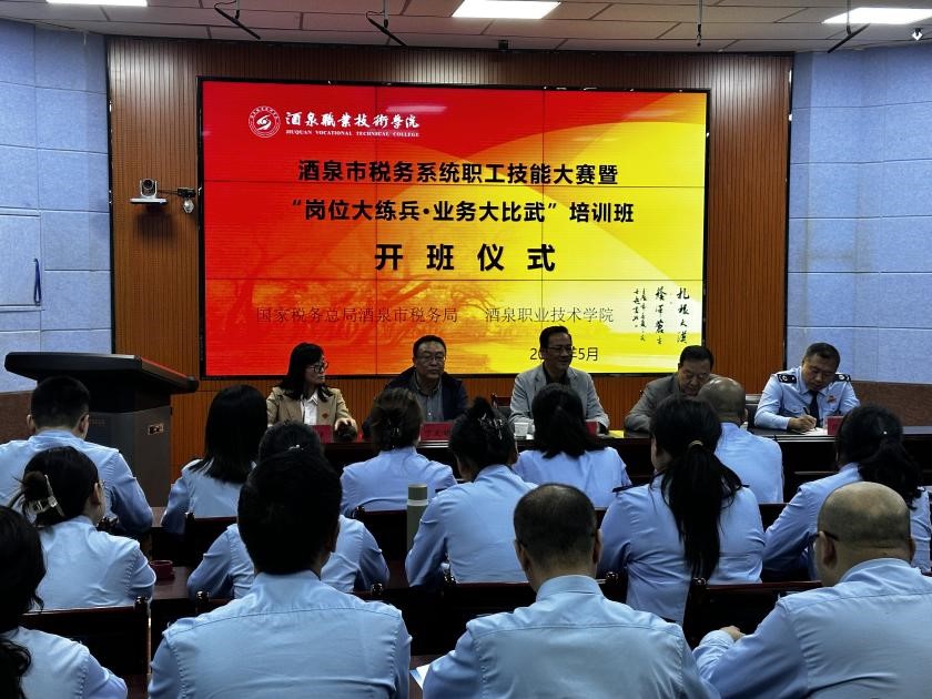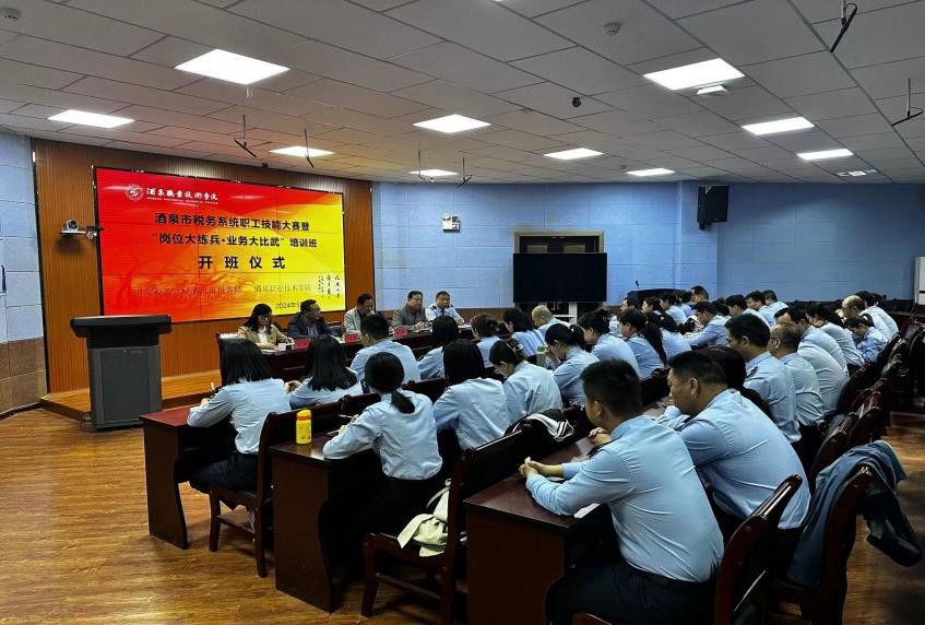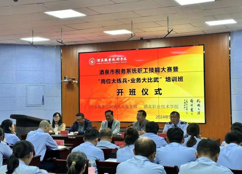 2024年5月10日上午,由国家税务总局酒泉市税务局主办、酒泉职业技术学院承办的税务系统职工技能大赛暨“岗位大练兵 业务大比武”培训班正式开班。来自全市各县区税务系统42名一线工作人员开启在酒泉职业技术学院为期十天的培训。国家税务总局酒泉市税务局党委委员、副局长刘长洲,酒泉职业技术学院党委委员、纪委书记、监察专员魏韡,国家税务总局酒泉市税务局人事科科长陈志东,经济管理学院院长丁天明等同志出席开班仪式。经济管理学院党支部副书记杜静主持开班仪式。