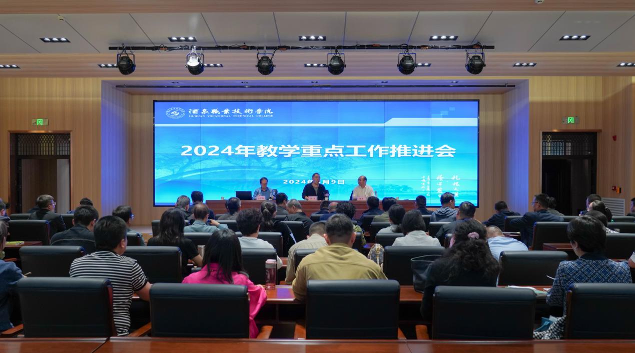 要闻快递 > 正文2024年5月9日下午,学校在弘毅楼启明厅召开了酒泉职业技术学院2024年教学重点工作推进会。党委副书记许军出席会议并讲话。计划财务处、组织人事处、各教学单位负责人、分管教学工作副院长、酒泉卫生学校、酒泉工贸中等专业学校分管教学负责人、教务处(教师发展中心、实验实训管理中心)全体工作人员及相关教师代表参加了会议。