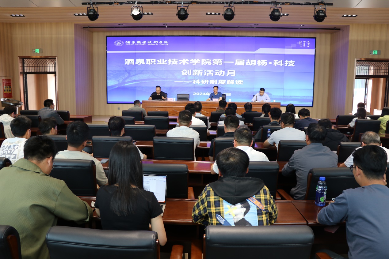 王金明强调了开展胡杨·科技创新活动月的重要意义,他要求各学院要做到思想上重视,内容上创新,成果上突出,要营造良好的科研氛围,积极引导广大教师开展科研工作。李增鹏 “以‘强科技’行动为引领 靶向施策助力学校高质量发展”为题作交流报告,从科研管理制度、科研处主要业务和科研诚信三方面进行了深入浅出的讲解,并对教师提出的问题进行了详细解答。