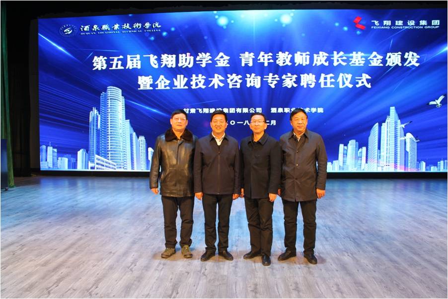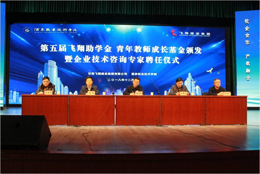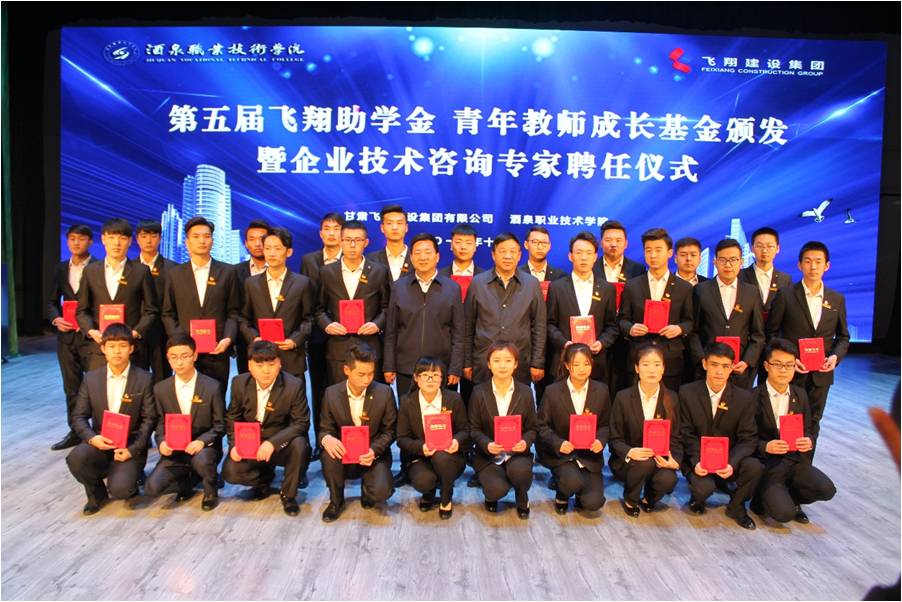 在颁发仪式上,甘肃飞翔建设集团有限公司总经理孙耀忠宣读了“关于颁发第五届飞翔助学金、青年教师成长基金及聘请企业技术咨询专家的决定”。校企领导共同向获得资助的学生和老师颁发证书,由企业领导向企业技术咨询专家颁发聘书,并与之合影留念。来自17级“飞翔成才班”的尉强强同学代表资助学生发表感言。他向同学们介绍了自己在“飞翔成才班”的学习内容和显著成效,表示以感恩之心努力学习,以实际行动回报学校、企业对自己成长的无私关爱和帮助。王泽荣老师代表青年教师成长基金获得者发表感言。飞翔青年教师成长基金的颁发,是对青年教师科研工作的肯定与鼓励,更是对青年教师今后教学科研的鞭策和敦促。在今后的生活、工作和学习中,, “百尺竿头更进一步”!随后,甘肃飞翔建设集团有限公司党委书记、董事长魏强在致词中对土木工程系同学们提出了有感恩之心、有发展之愿、有作为之念的殷切希望,对新时代校企合作提出了新看法、新目标。