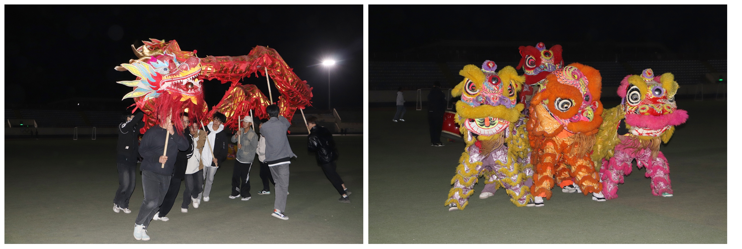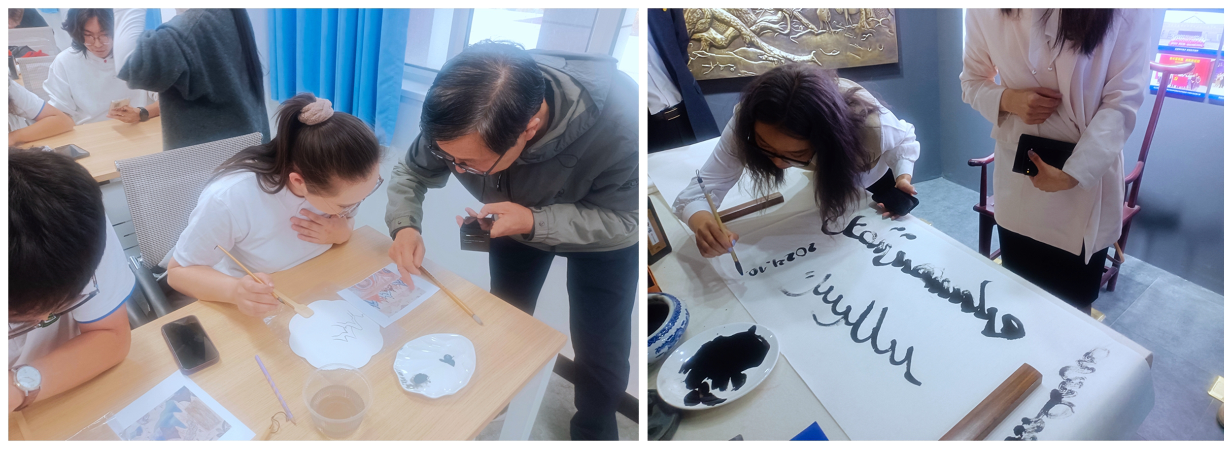 在体育场,研学团师生们观看了胡杨国旗护卫队的升旗仪式、队列队形、军体操表演及学校舞龙队、舞狮队等特色社团的精彩表演,让师生们感受到了学校特色社团的魅力和活力,深刻感受到了酒职学人的风采和魅力。在体育馆中蒙学生进行了跳绳、负重跑、羽毛球比赛。在飞天书画院和敦煌彩塑技艺传习所中蒙学生一起研习了中国传统技艺。