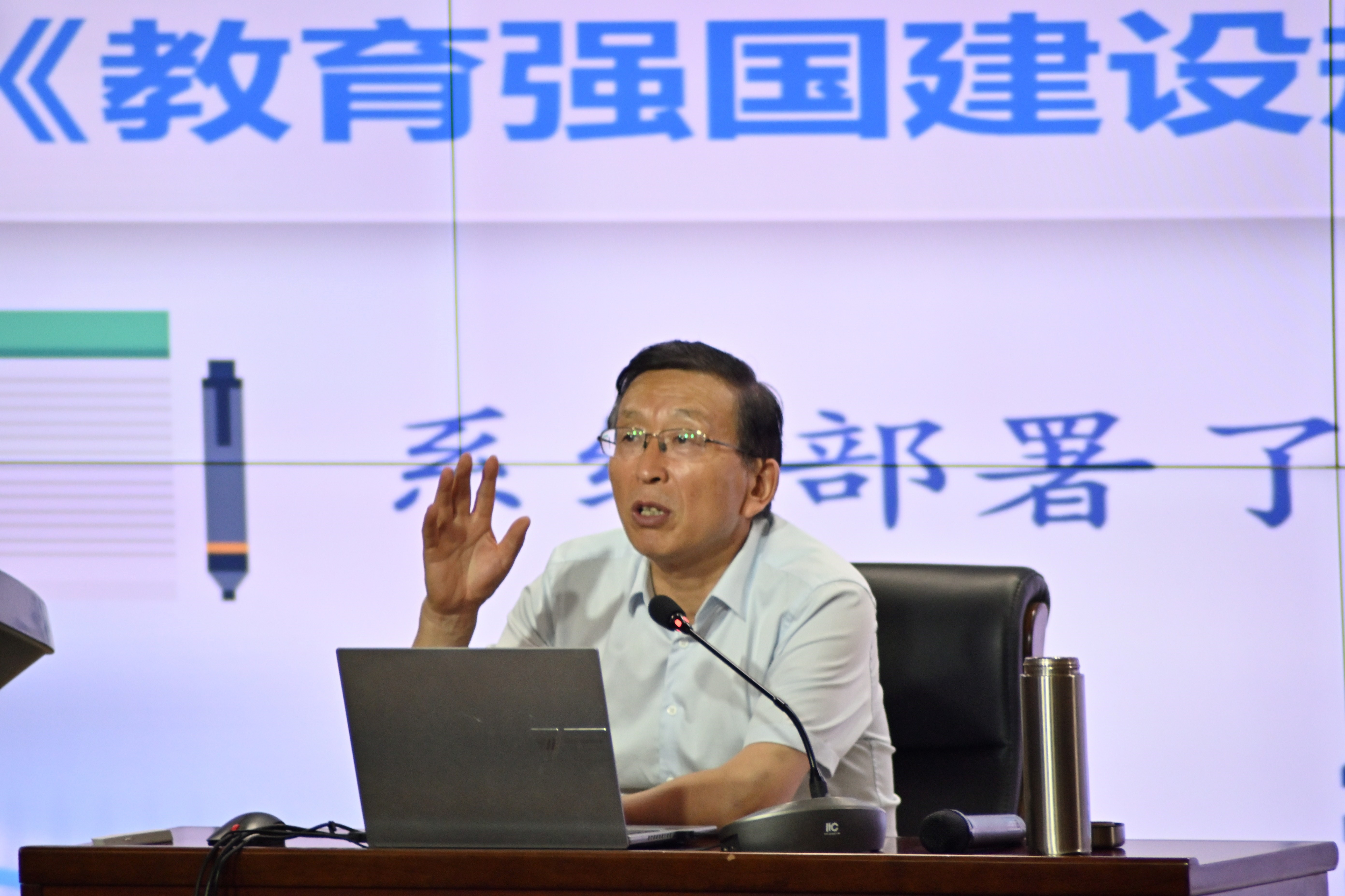 2025年5月19日晚,学校党委书记易志军教授以“从教育大国迈向教育强国”为主题,在弘毅楼闻道厅为教育与艺术学院学生讲授了一堂生动的形势政策课。课程深入解读了国家教育强国建设的战略部署,并结合国际形势和学校实际,激励青年学子勇担使命,为全面建设社会主义现代化强国贡献青春力量。