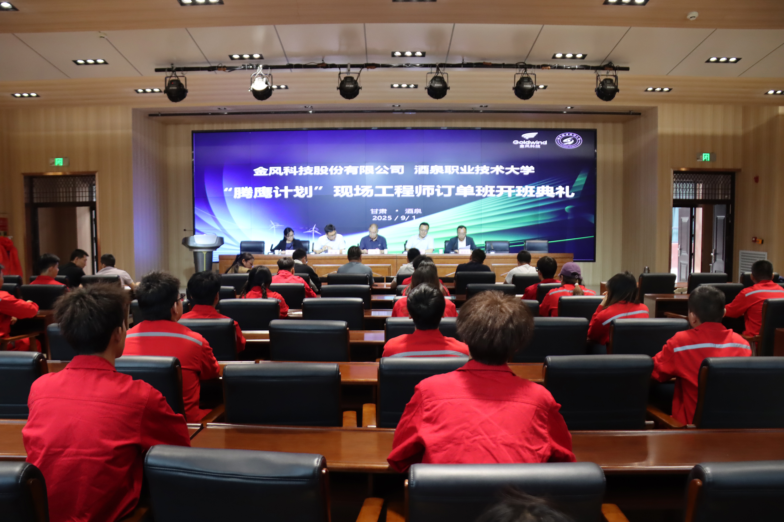 2025年9月1日下午,金风科技“腾鹰计划”现场工程师订单班开班典礼在酒泉职业技术大学举办。金风科技股份有限公司金风创培副总经理杨华,学校党委副书记、校长许军,金风教育培训中心产品研发总监陈斌等校企领导出席仪式。