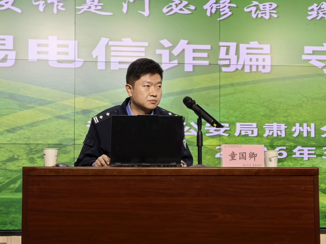 要闻快递 > 正文为深入贯彻落实省教育厅关于开展“法治教育开学第一课”的工作部署,结合学校2026年春季学期法治宣传教育主题班会安排,切实增强学生法治素养与防范电信网络诈骗能力。2026年3月12日晚,学校在弘毅楼C座101闻道厅举办“警惕电信诈骗·守护青春年华”安全教育专题讲座。讲座邀请酒泉市公安局肃州分局刑事侦查大队副大队长童国卿担任主讲。学校党委委员、副校长王金明主持活动。学生工作部负责人、各学院师生代表现场参加,全体在校学生8000余人通过线上直播方式同步收看学习。