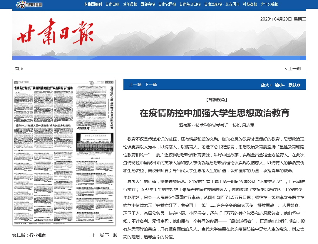 要闻快递 > 正文4月29日,《甘肃日报》发表了党委书记、校长易志军的署名文章《在疫情防控中加强大学生思想政治教育》。