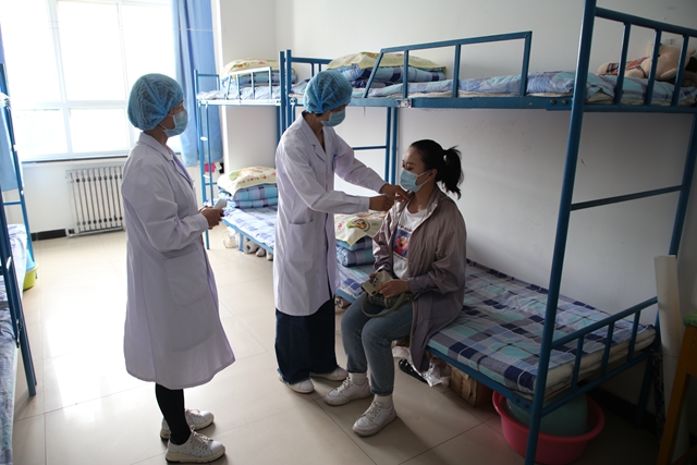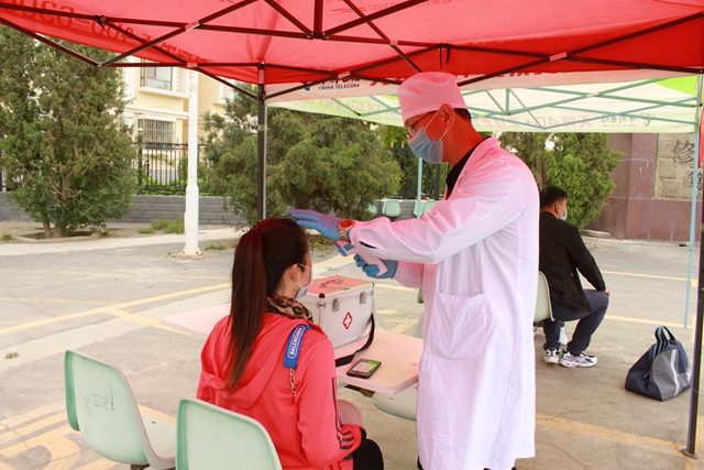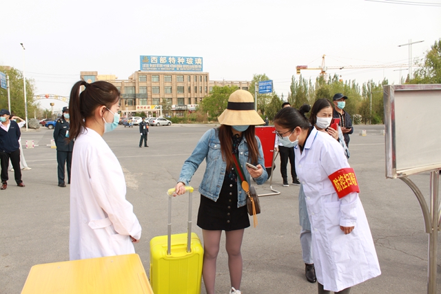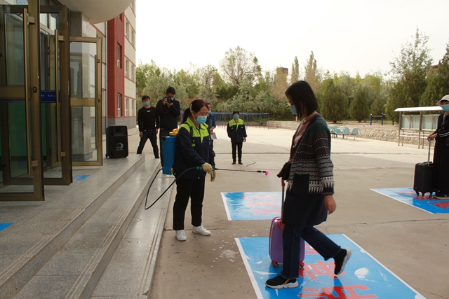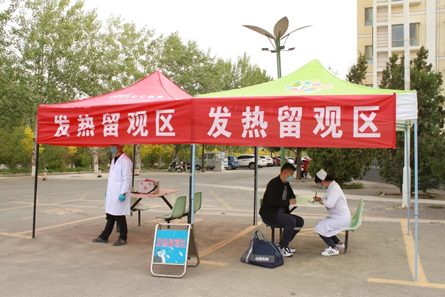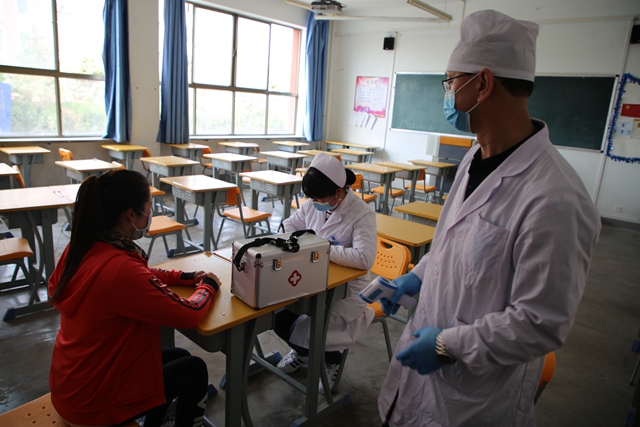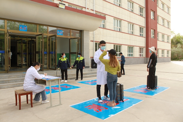 环节一学生返校入校演练:学生乘坐火车、私家车或出租车抵达学校西门,由工作人员有序引导学生下车。入校前,学生需向工作人员出示通信大数据行程卡,查验本人在返校前14天到访的境外国家或者地区的信息,学生出示绿色卡正常放行;学生出示黄色卡或红色卡,将被带到发热隔离区作进一步确认;手持绿色卡的学生由工作人员对其测量体温,发现体温异常者,将会被带至发热隔离区作进一步检查。医务人员将启动发热应急预案,疑似新冠肺炎者将会送到酒泉市人民医院发热门诊就诊,普通发烧者将被送到学校隔离留观室。